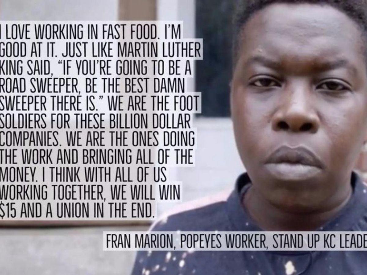 Fran Marion is one of the leading voices for "Stand Up Kansas City," a group of fast food workers fighting for a $15 an hour minimum wage in the U.S. She has been employed in the fast food industry for 22 years, and despite working six days a week, Fran is still unable to afford a home for her and her two children. She is currently sleeping on a friend's couch, while her two daughters stay at another friend's house an hour away.