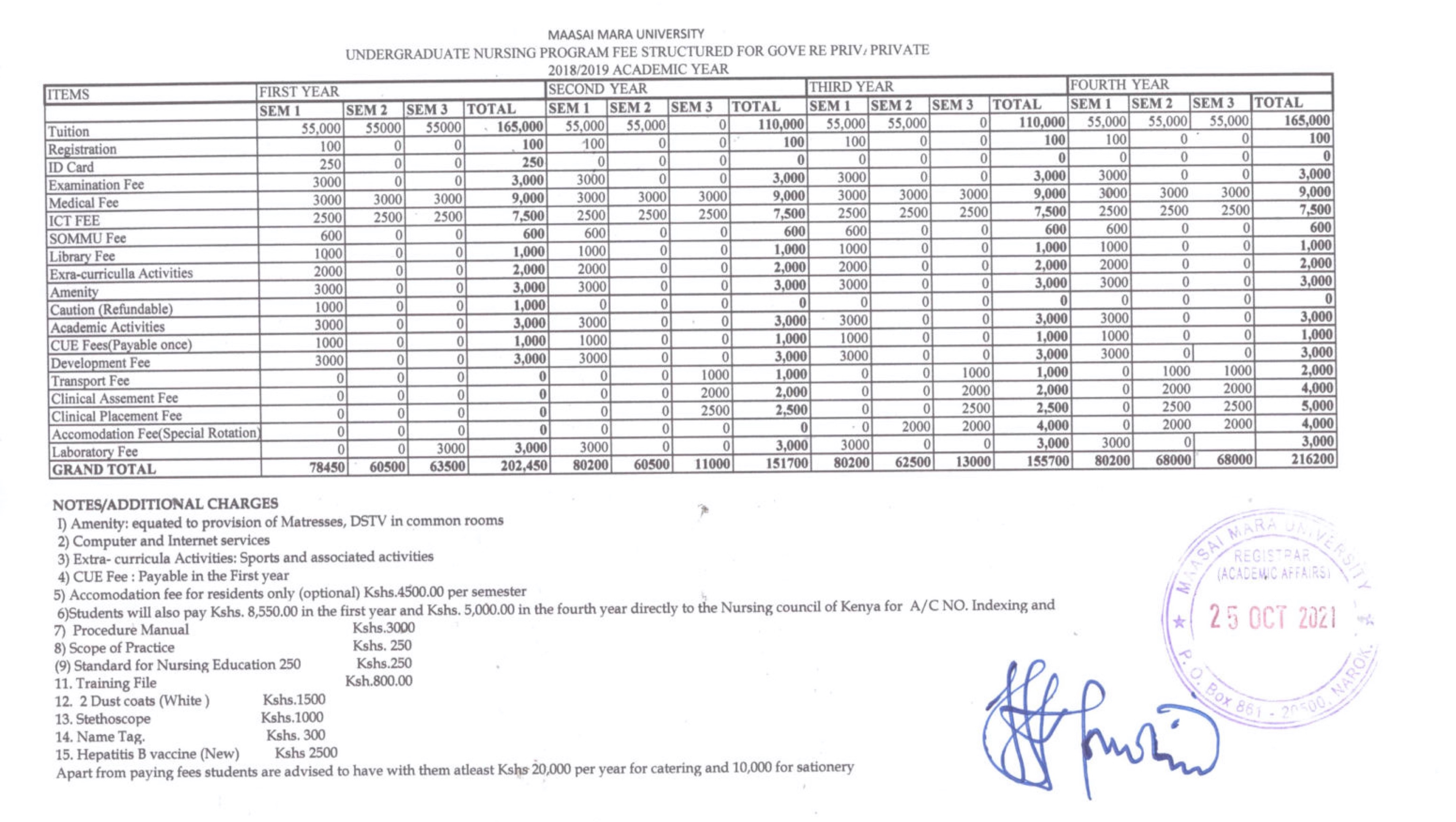 The breakdown of costs for the Maasai Mara University Medical Program starting in August 2023 are as follows (including university accommodation, examination fees, and nursing equipment):