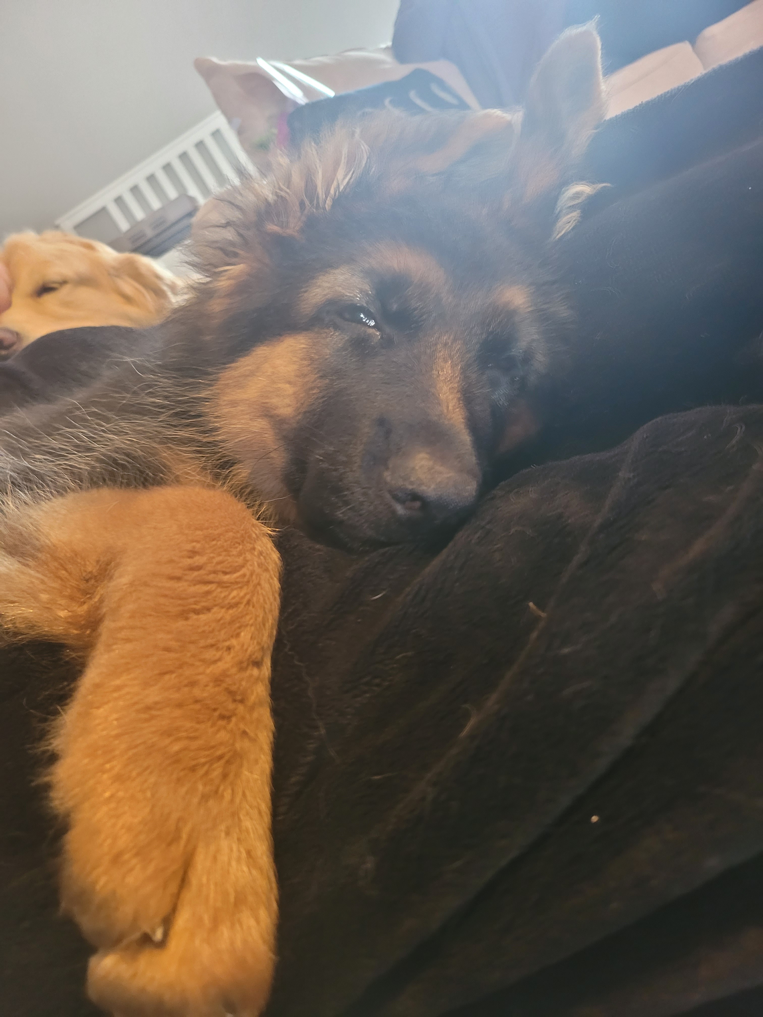 Freya is a 5-month-old German Shepherd puppy who has already grown to over 75 pounds, an incredibly rapid growth that is contributing to her current condition. She lives with her owner, Nikki, alongside Fawkes (Nikki’s service dog) and their five cats, and she’s a deeply loved part of the family.