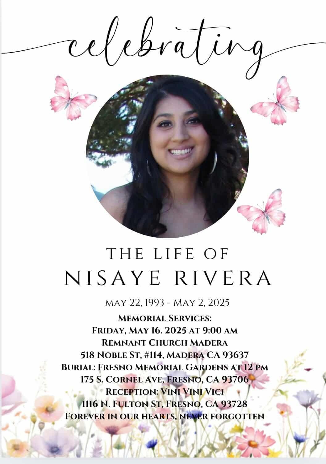 My name is Hidalgo Rivera. My daughter, Nisaye Rivera, recently passed away due to colon cancer. She was a queen till the end and was surrounded by her loved ones. My family and I were proud of how she handled herself during her time in the hospital. Upon discharge, she was visited by many of the hospital staff; tears and smiles were present. I will never forget their kindness.
