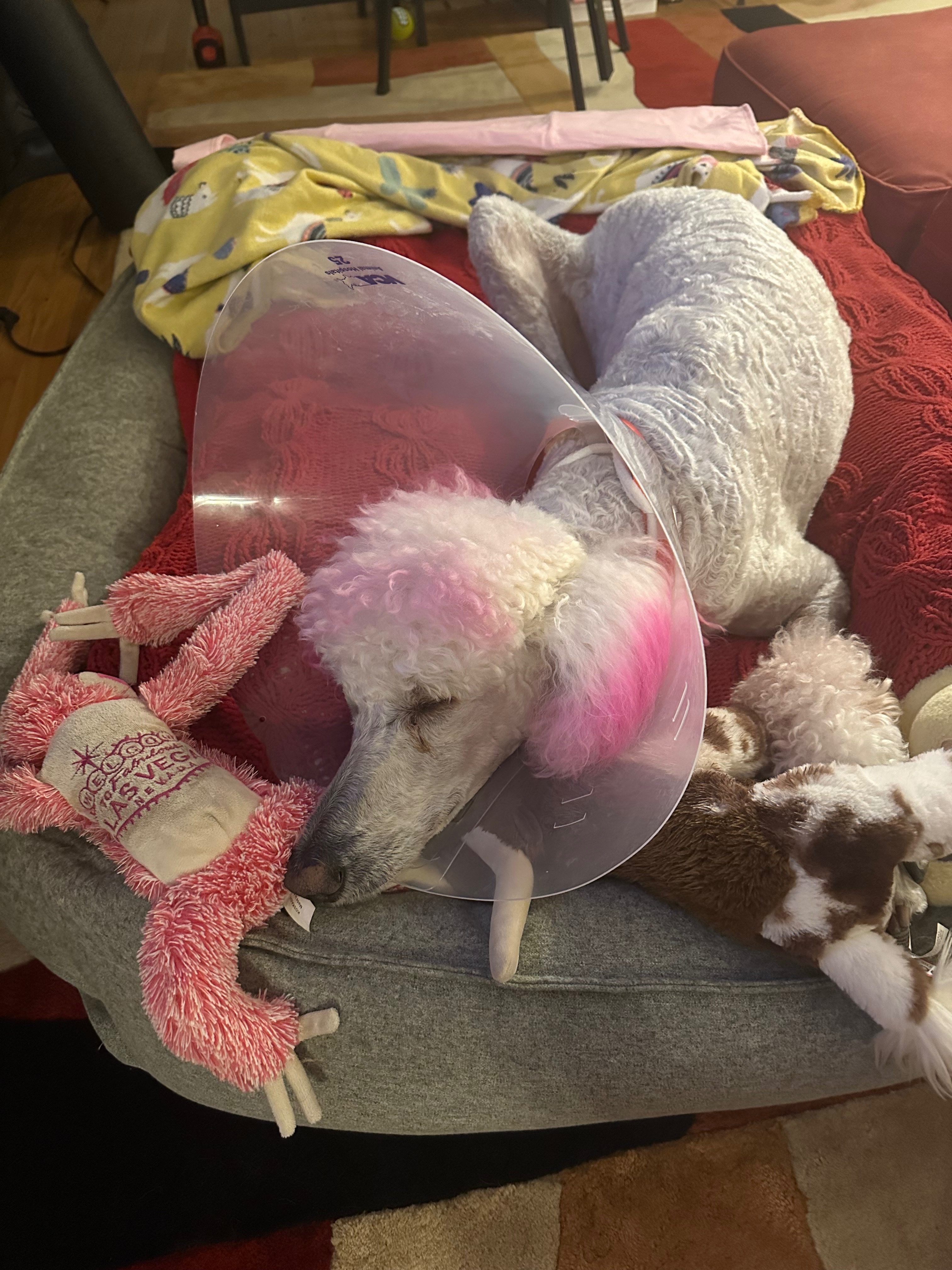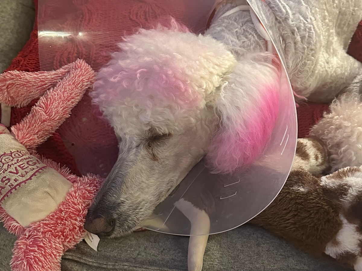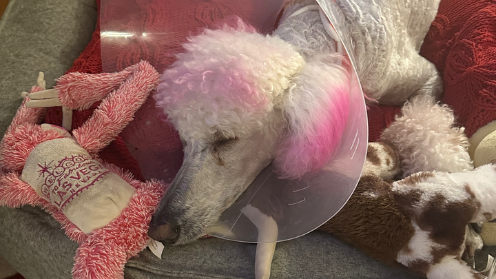 So here is the story of Miss Ziggy’s surgery... Last Friday, we went on a trip to Alabama to visit my grandmother and family and took our healthy 9 1/2-year-old standard poodle, who is quite popular among our friends and family, with us. When we got there, everything was fine until she had a case of GDV (bloat). Luckily, I recognized the symptoms from all the standard poodle groups I follow. I asked my aunt quickly where the closest emergency vet was in town, and we got her there immediately. This was around 8-9 pm on a Friday night. The vet looked at her and had us back to a little private room and gave us the choice of euthanasia or immediate surgery for $6-7k. It felt like a nightmare I never want to relive. Of course, there was no choice; she is my baby. She had the surgery, and we couldn’t see her until the next day, but it went well, and the vet said she was really healthy for her age. It was so hard seeing her like that and even harder leaving her for another night in a strange town with people she didn’t know. They took excellent care of her, and we were able to pick her up by Sunday afternoon and head back to South Carolina. It was a little stressful traveling that far with her knowing she just went through major surgery, but we did it, and we are home, and she is now recovering and has her people and lots of love. I’m so grateful to the staff and surgeon who saved her life and to everyone who loves and supports her. If you feel inclined to donate any small amount for her expenses, I will be forever grateful, but please don’t feel pressured. I am so grateful for all the prayers, love, and good vibes for her healing!
