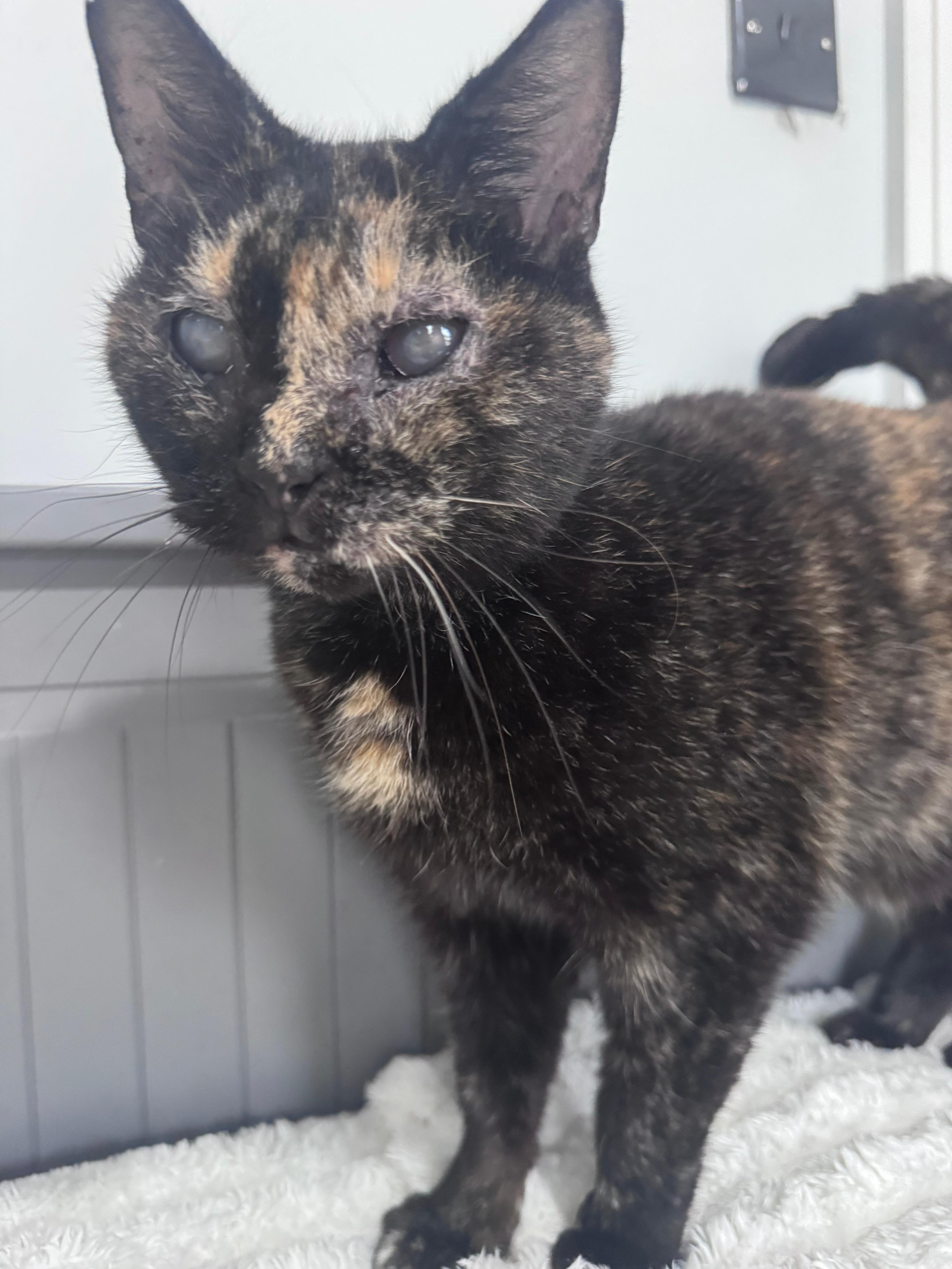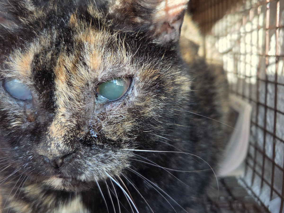 This poor little tortie girl has been fighting a tough battle on the streets, alone and without a home. Blind, with sick eyes causing her constant pain, she's been surviving on her own for far too long. When she was finally rescued, the vets told us that her condition is heartbreaking - her eyes are a source of immense suffering, and she's currently relying on three types of eye drops just to get some small comfort.