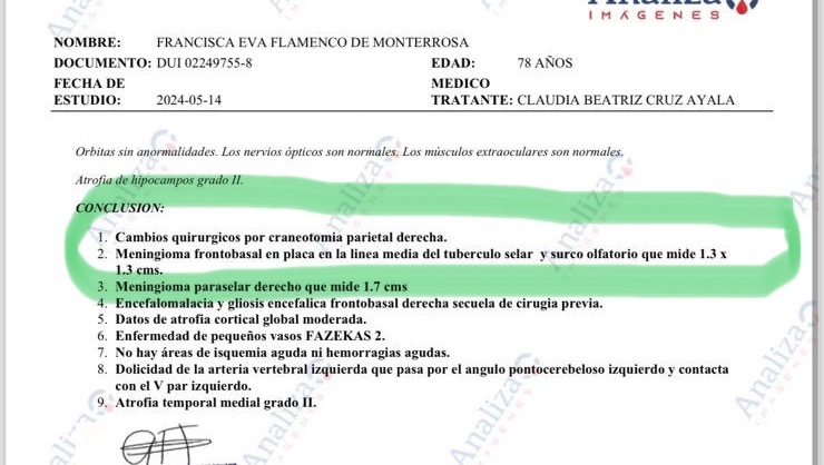on November 2023 she started feeling a tremendous pain in her left cheek, we visited so many doctors specialists, dentist, general Doctor's finally we had a diagnosis she had a illness call trigéminal nerve, this illness has no cure, she was treated with pain killers and medical treatment, which had no success, my mother was loosing her ability ro speak, eat, sleep and walk, we decided to take her back to the specialist that did her surgery he immediately ordered a MRI.