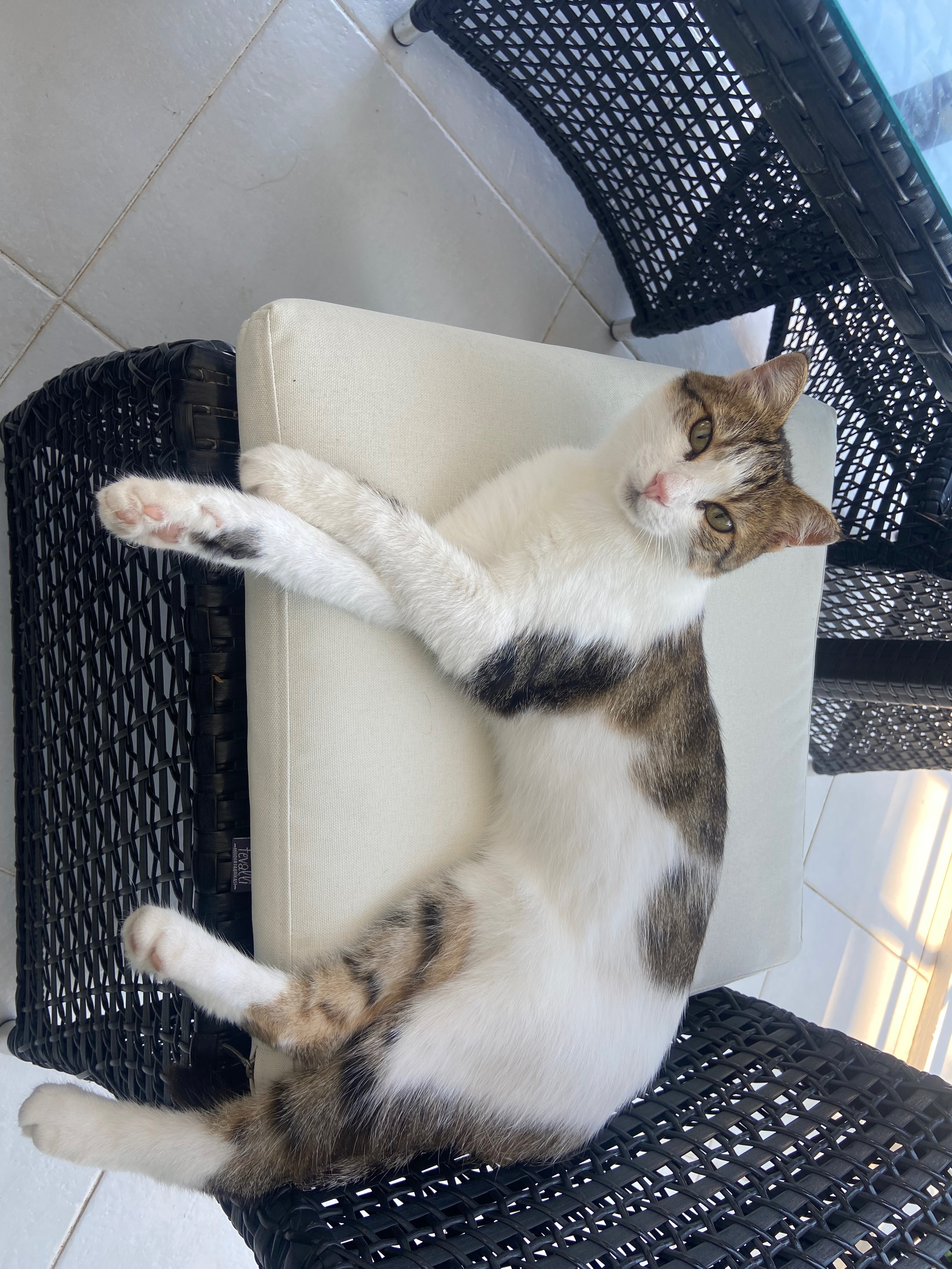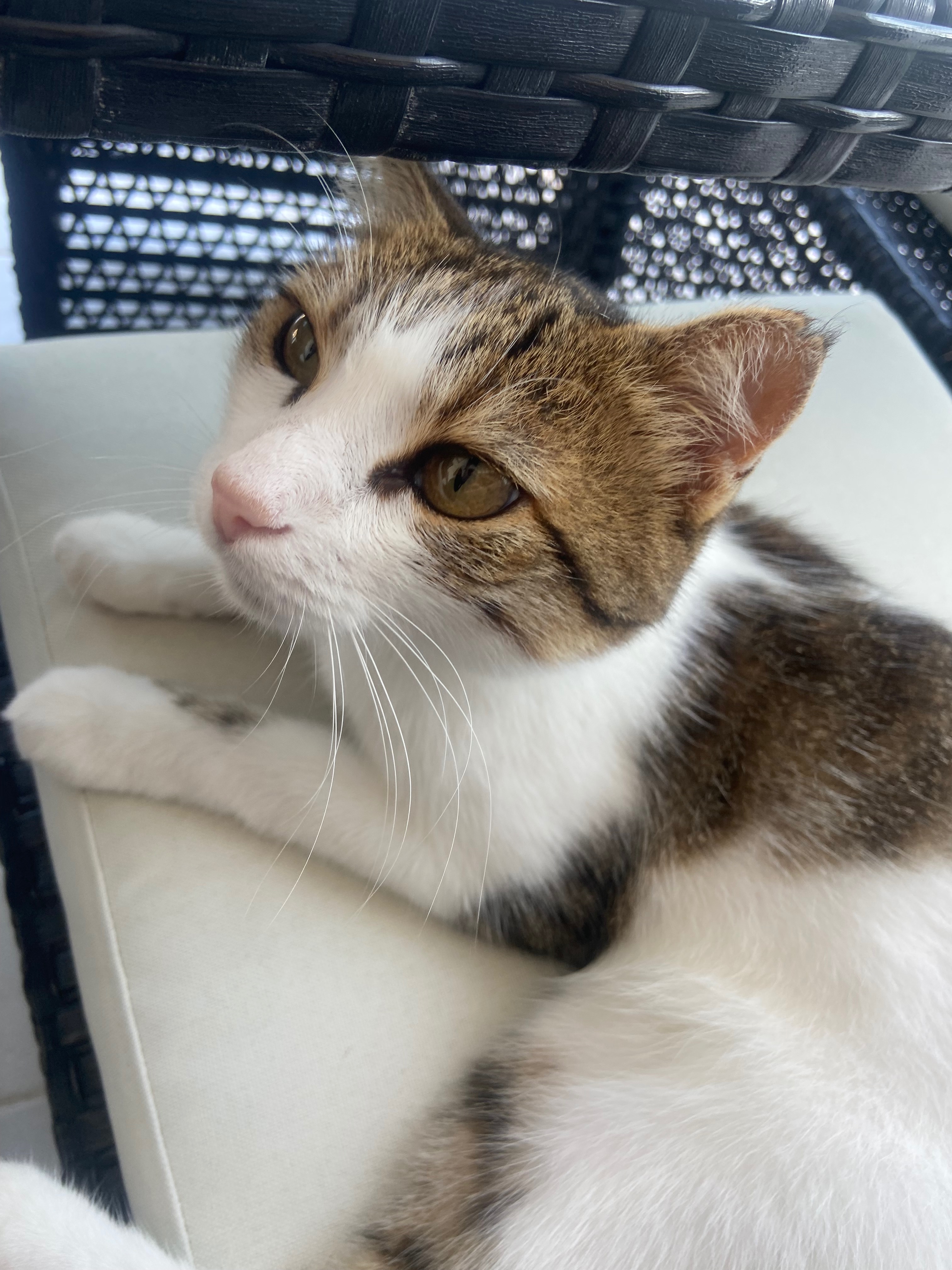 She is a very young cat, and is clearly desperate for a loving home and family to live with - she wants nothing more than someone to cuddle up with on the sofa and a bed to sleep on.