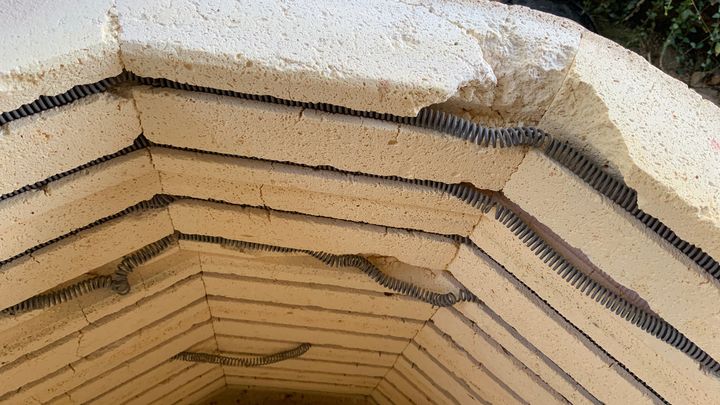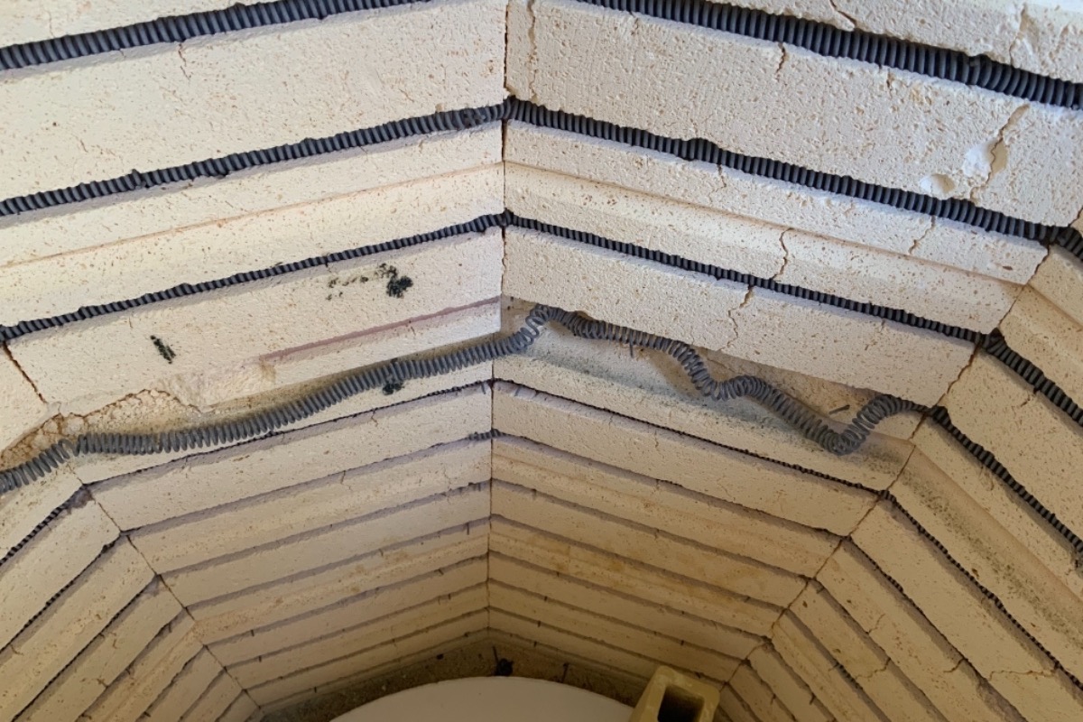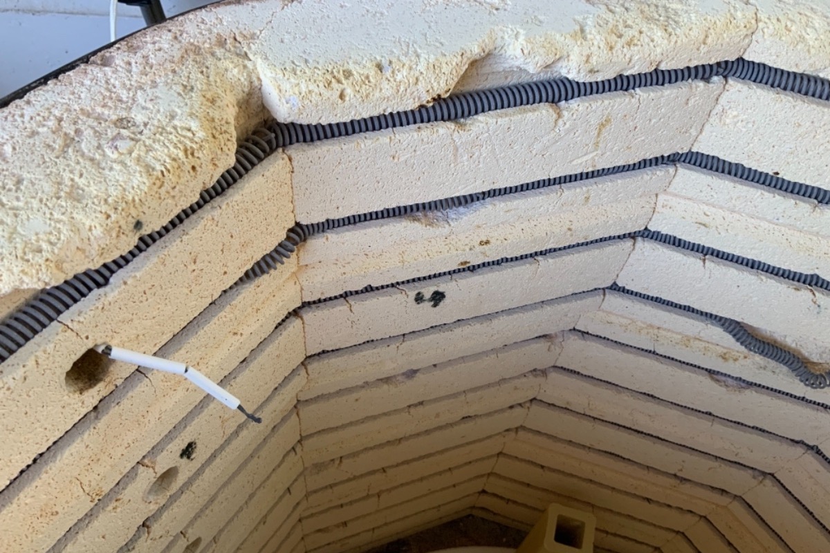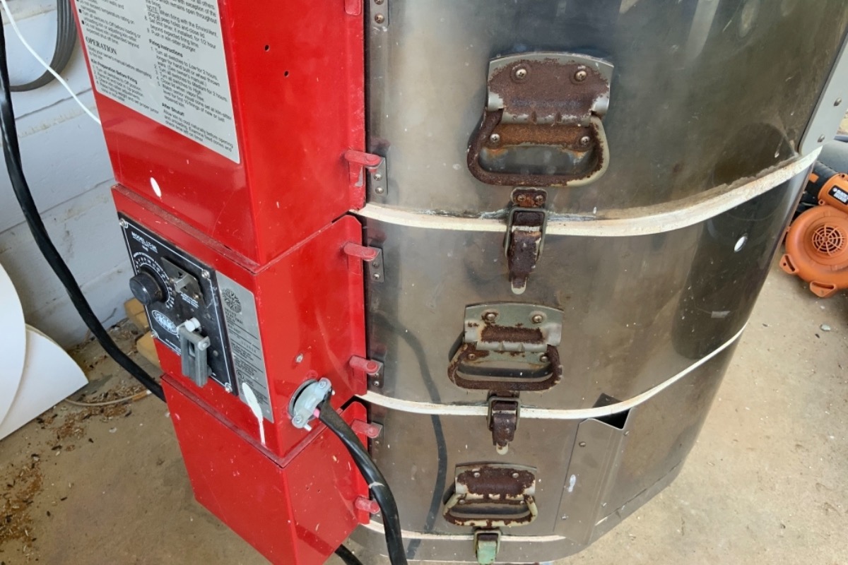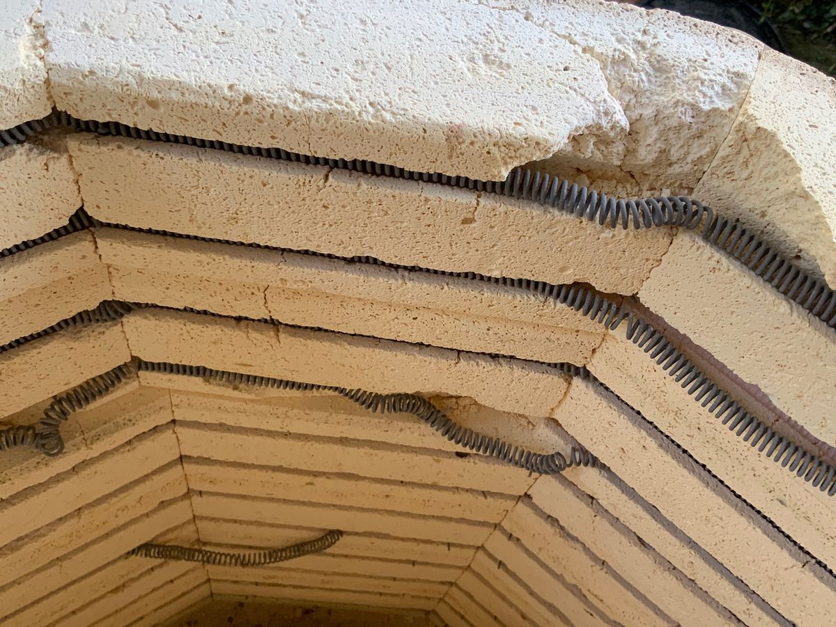 First, the kiln bricks are falling apart, and literally crumbling off every time I fire. This brick crumbling is making it so the elements (which I just replaced last year) are falling out of their channels. Also, the rust on the outside is getting out of hand. See photos below.