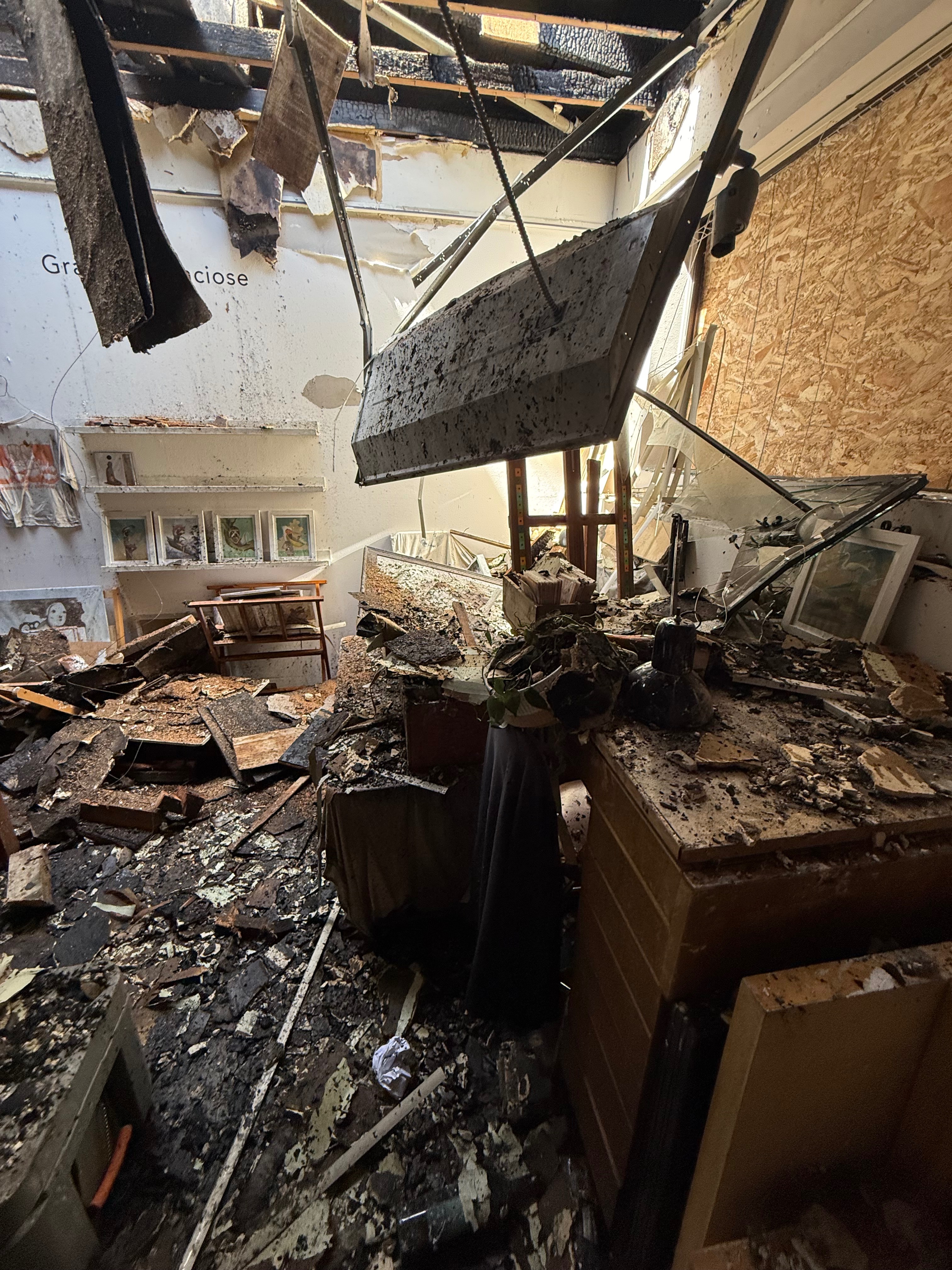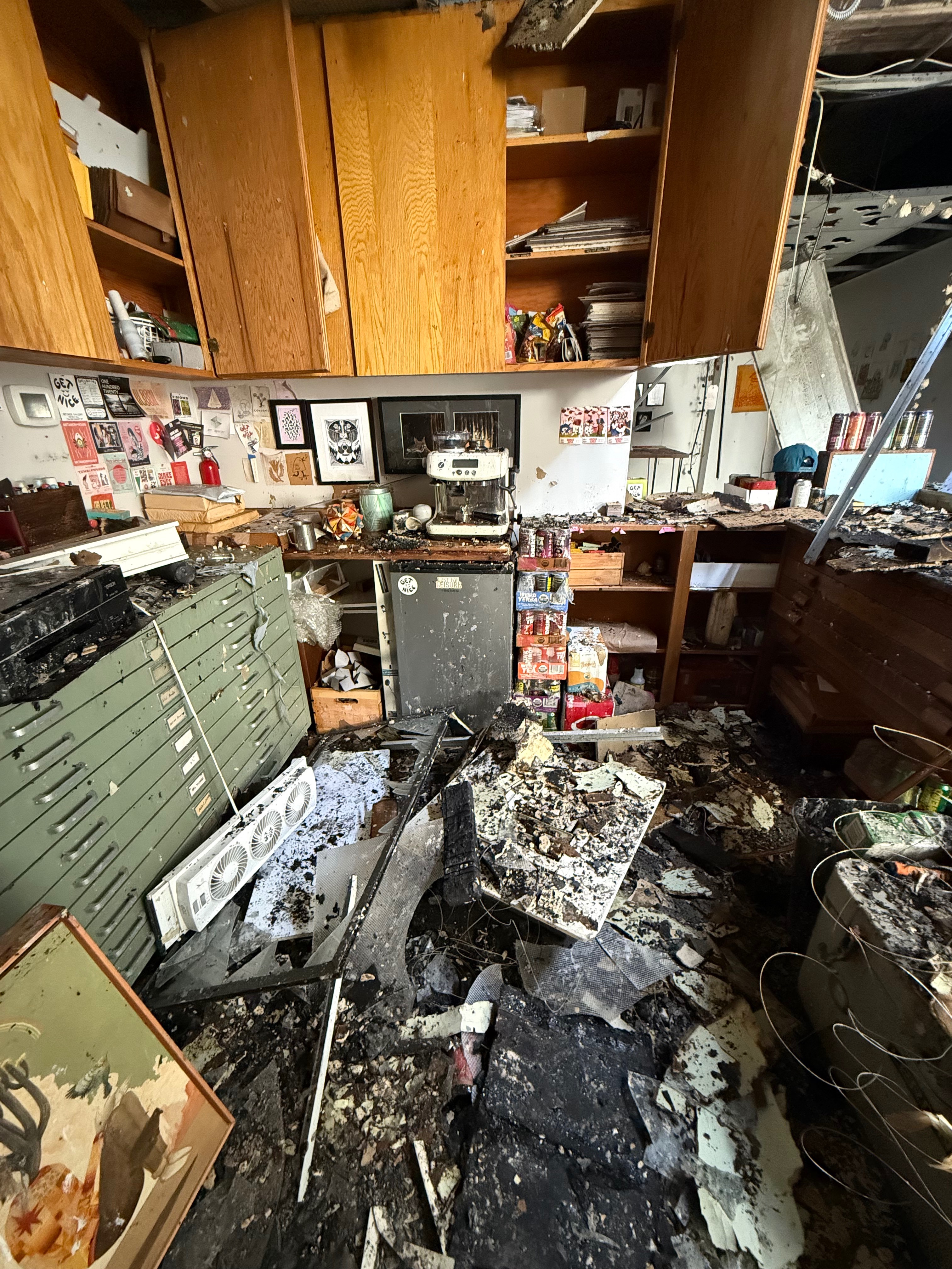 On Friday August 8th around 8:45pm, a fire was started behind the Ballard Collective building in Seattle, WA. First responders quickly arrived on the scene to extinguish the fire that engulfed the back of the building. Thankfully no one was hurt—however Get Nice. Gallery and Graham Franciose Studios suffered massive damage. Original works and countless prints lost, as well as a brand new collaborative show from artists Travis Millard & Michael Sieben (set to open today, Saturday August 9th) has nearly all been destroyed. Get Nice. Gallery and Graham Franciose Studio are now facing vast challenges as they set out to rebuild and recover.