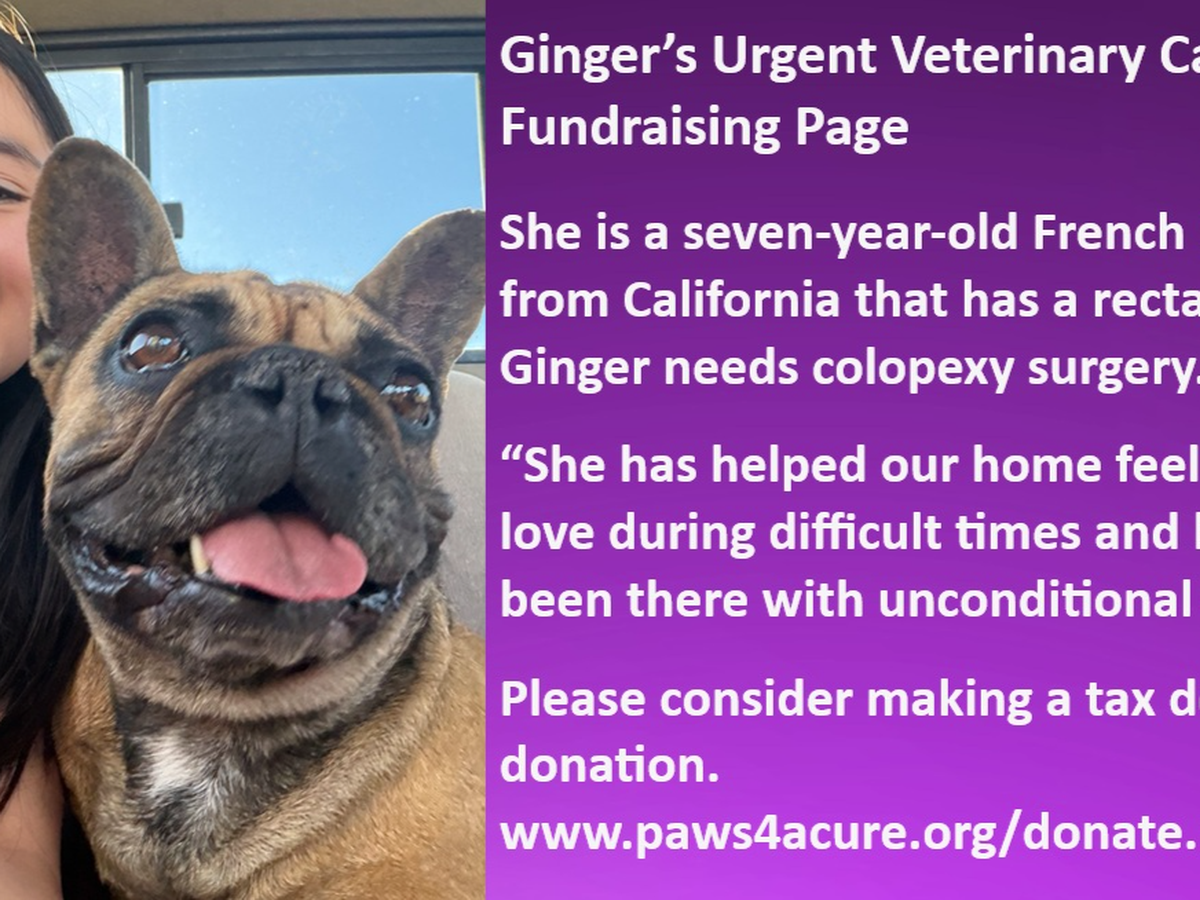 Meet Ginger, a sweet seven-year-old French Bulldog from California who is facing a painful challenge—with a rectal prolapse. She needs colopexy surgery. Her surgery is estimated to cost $2,500. Paws 4 A Cure is providing a $400 grant, but her mom is trying to raise $2,100 for the remainder of the funds that Ginger needs to move forward with the treatment.