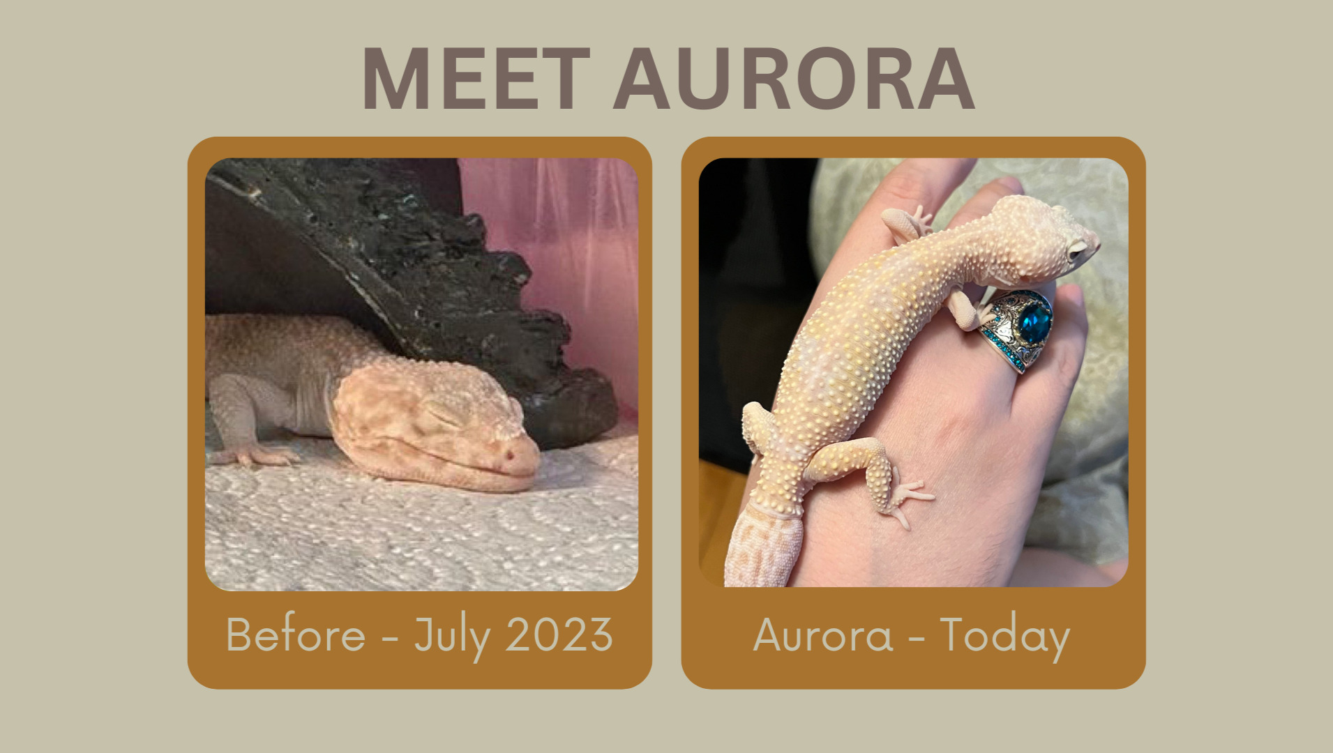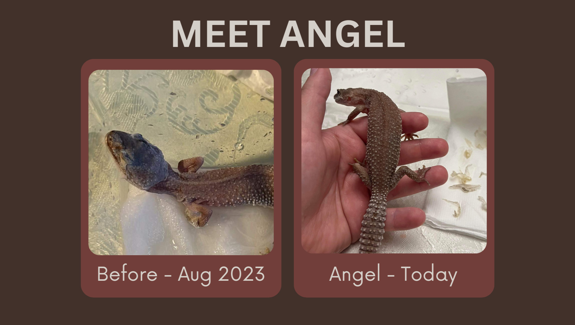 Angel was surrendered to me from a woman who was surprised by a leopard gecko on her door step in critical condition. I drove 5 hours and 20 minutes to pick up Angel and give her the vet care she needed when we came back. She still has a long recovery to go and is here to stay with us.