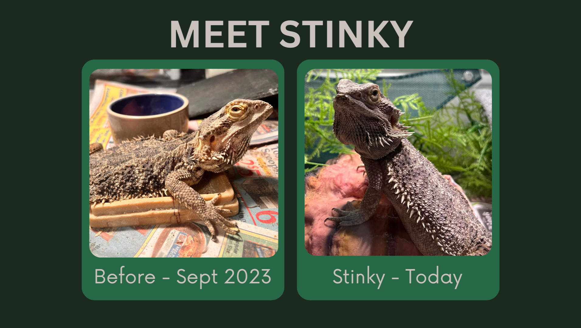Stinky was given to a mutual of mine in an undersized enclosure with nothing except a cork log and sand as substrate. Stinky was given to me for extra TLC, vet care, and then find a forever home! Her previous owner never introduced her by name so we named her Stinky because the enclosure smelled terrible when she was rescued... she also hates baths.