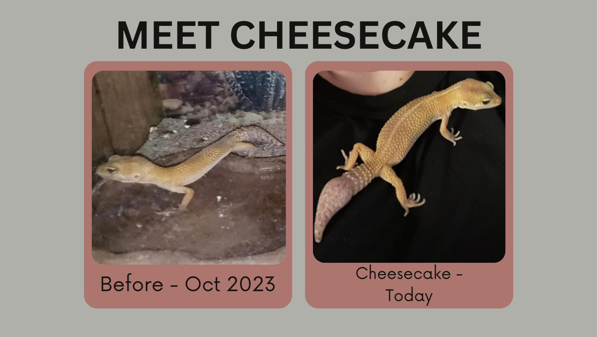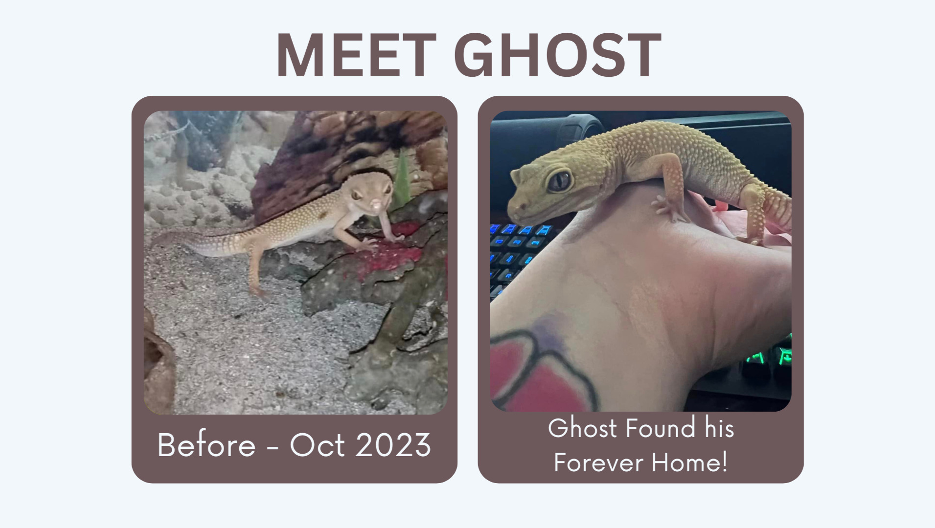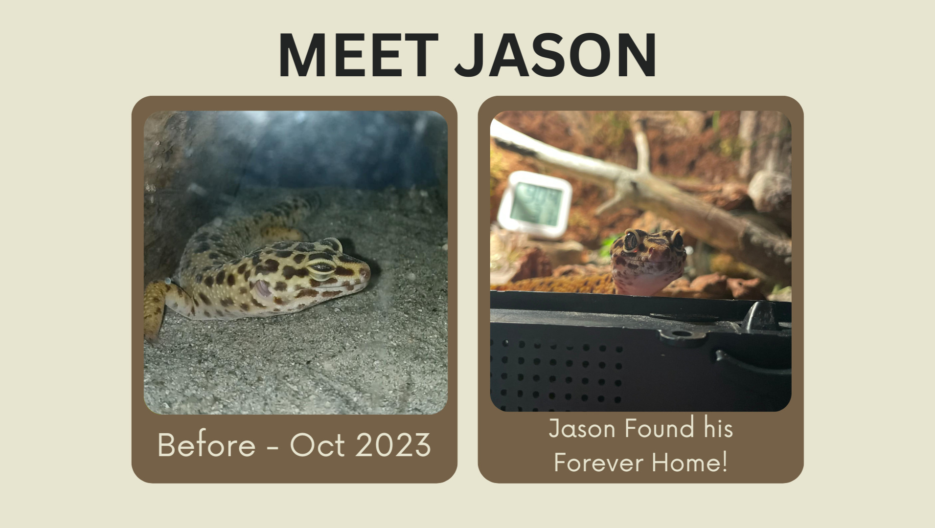 Jason was rescued along with Cheesecake and Ghost (pictured below). He was in a 10 gallon enclosure and fed 12 crickets monthly. Jason never had heat or UVB. He is a sweet gecko and eventually found his forever home where he is now named Gohan!