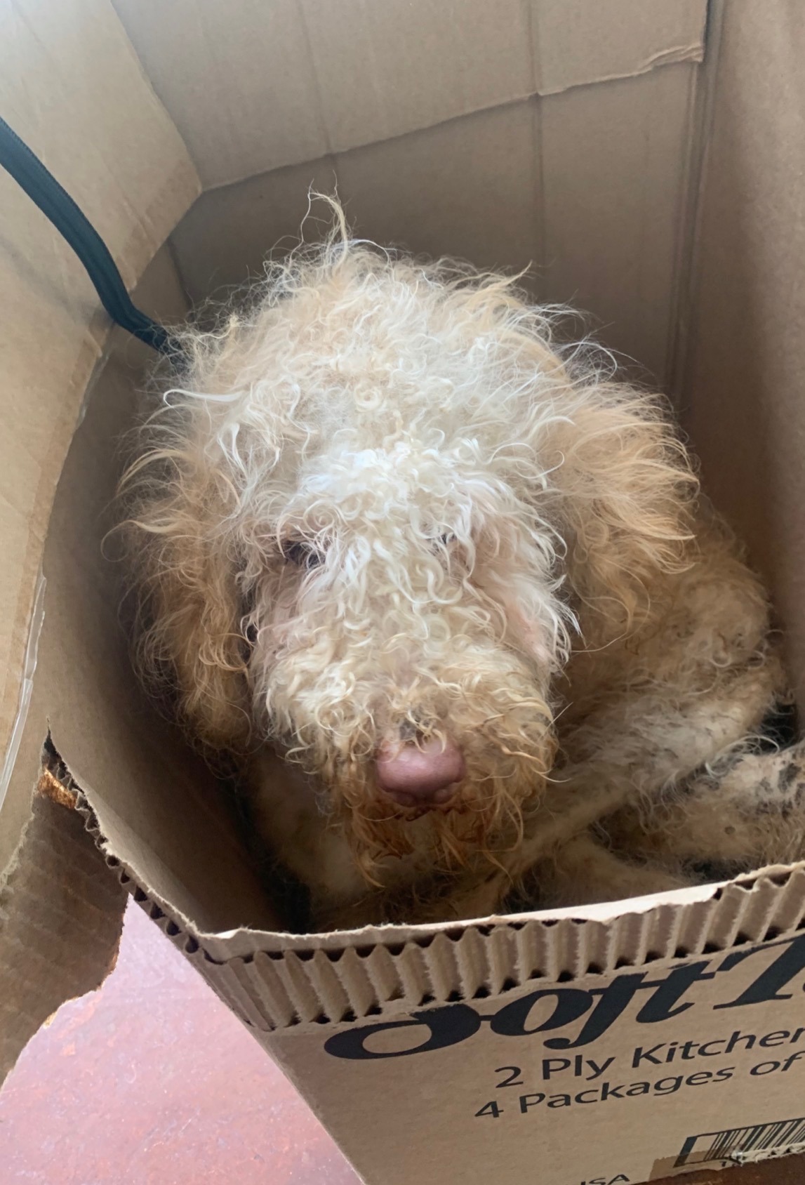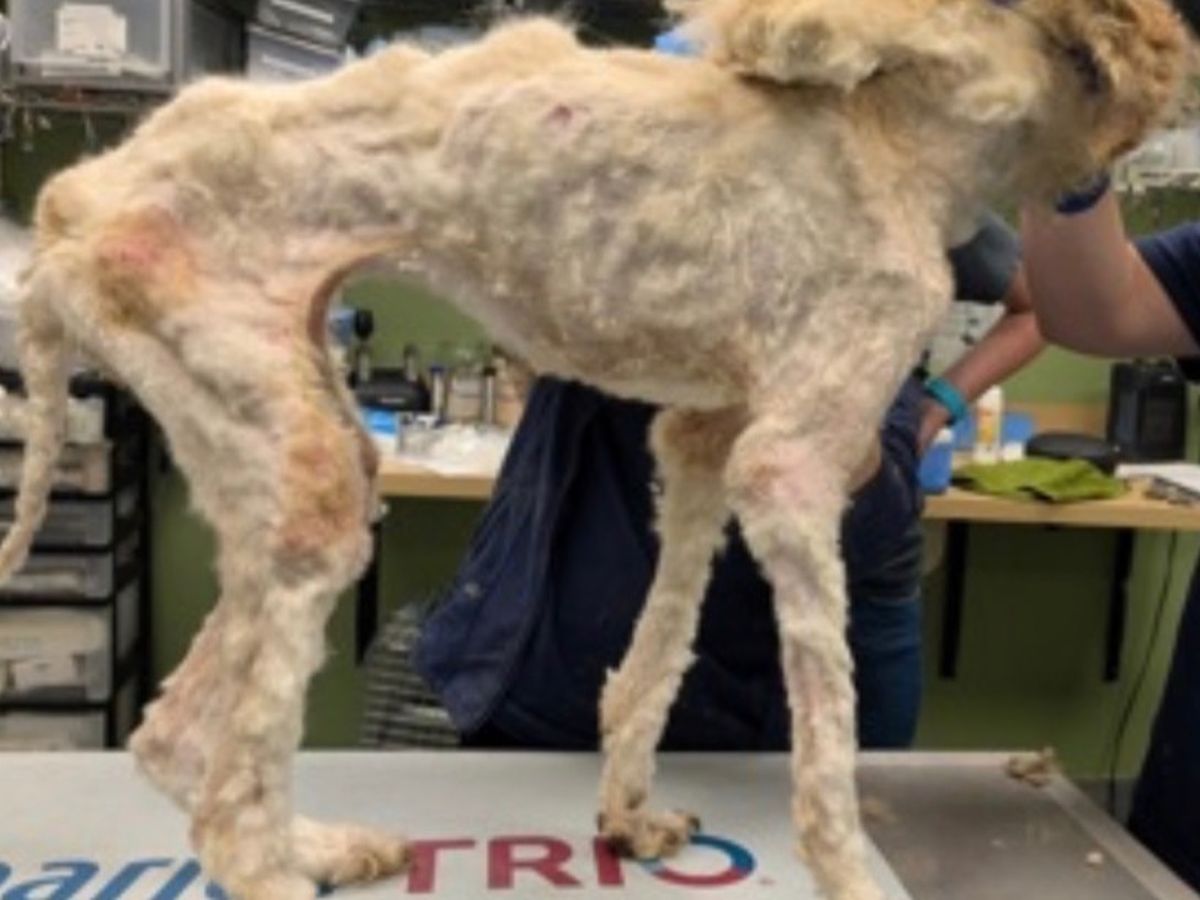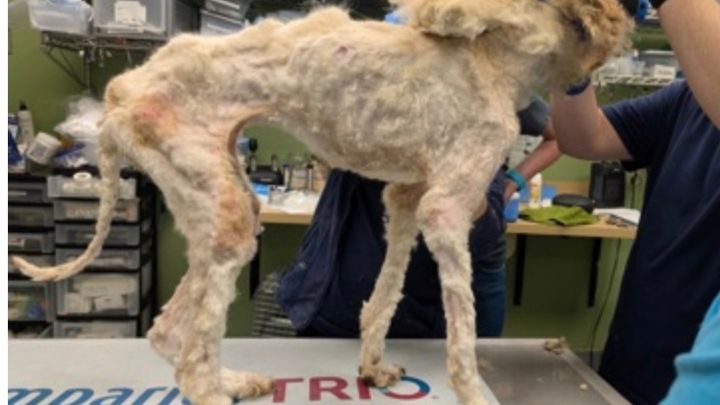 Goldilocks, a young standard poodle, was found abandoned in a box with a 'free dog' sign in the New Orleans area. A kind-hearted person brought her to a local animal shelter, where staff were shocked by her condition. She was severely matted, dangerously thin, and so weak she could barely move. The shelter staff performed an emergency shave and discovered she was only 15 pounds—less than half of what a healthy standard poodle her age should weigh. Large sores had formed on her elbows, and she was extremely dehydrated. Despite her suffering, Goldilocks managed a gentle tail wag, showing her sweet spirit even in the worst circumstances.