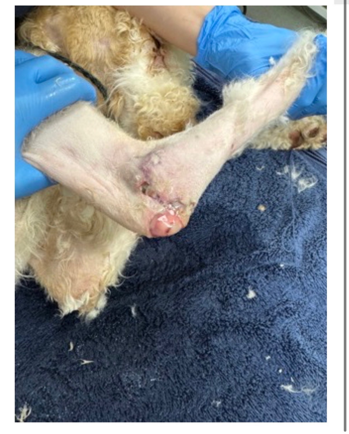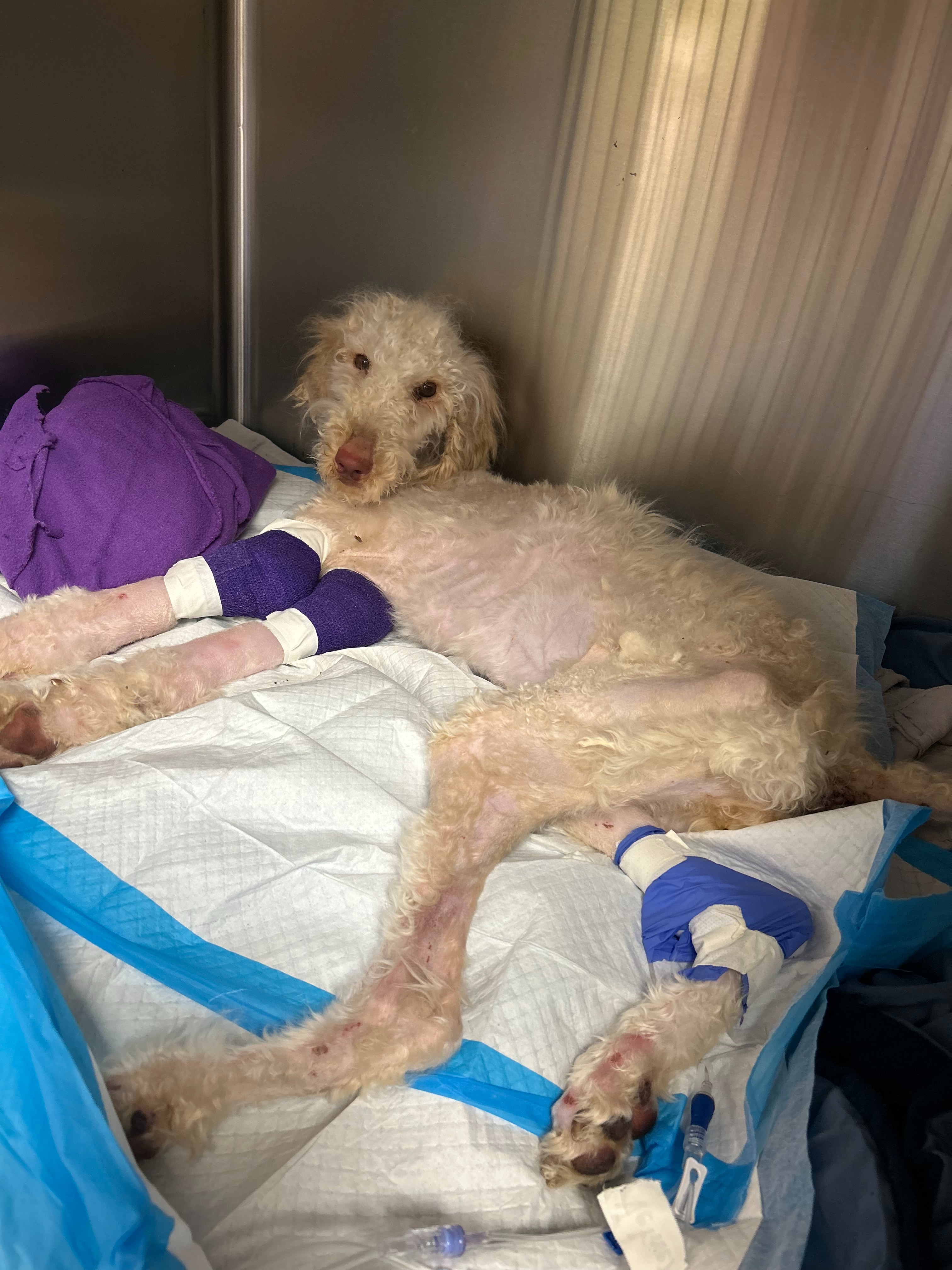 Recognizing the severity of her condition and the extensive care she would need, the shelter reached out to Creole Poodle Rescue. Our rescue quickly arranged for Goldilocks to be transported to Sherwood South Animal Hospital and Emergency Care Center in Baton Rouge. There, Dr. Lee and the veterinary team began intensive treatment. Goldilocks will need at least a week of hospitalization, and in the coming weeks, she will require skin grafting surgery to treat the exposed bones on her elbows. The costs for her care will be significant, a challenge for our small rescue.