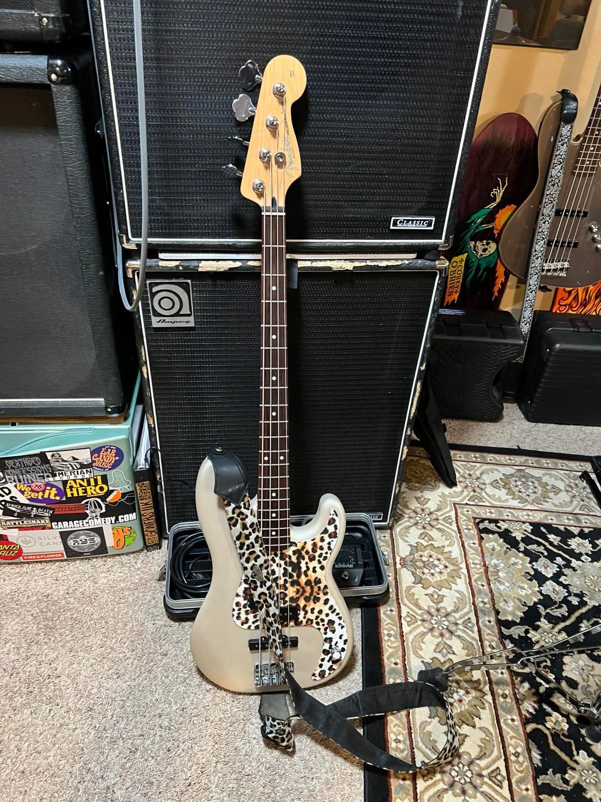 Fender Deluxe PJ bass (champagne color, cheetah pick guard) in hard case with GONERS UK spray painted on it $600
