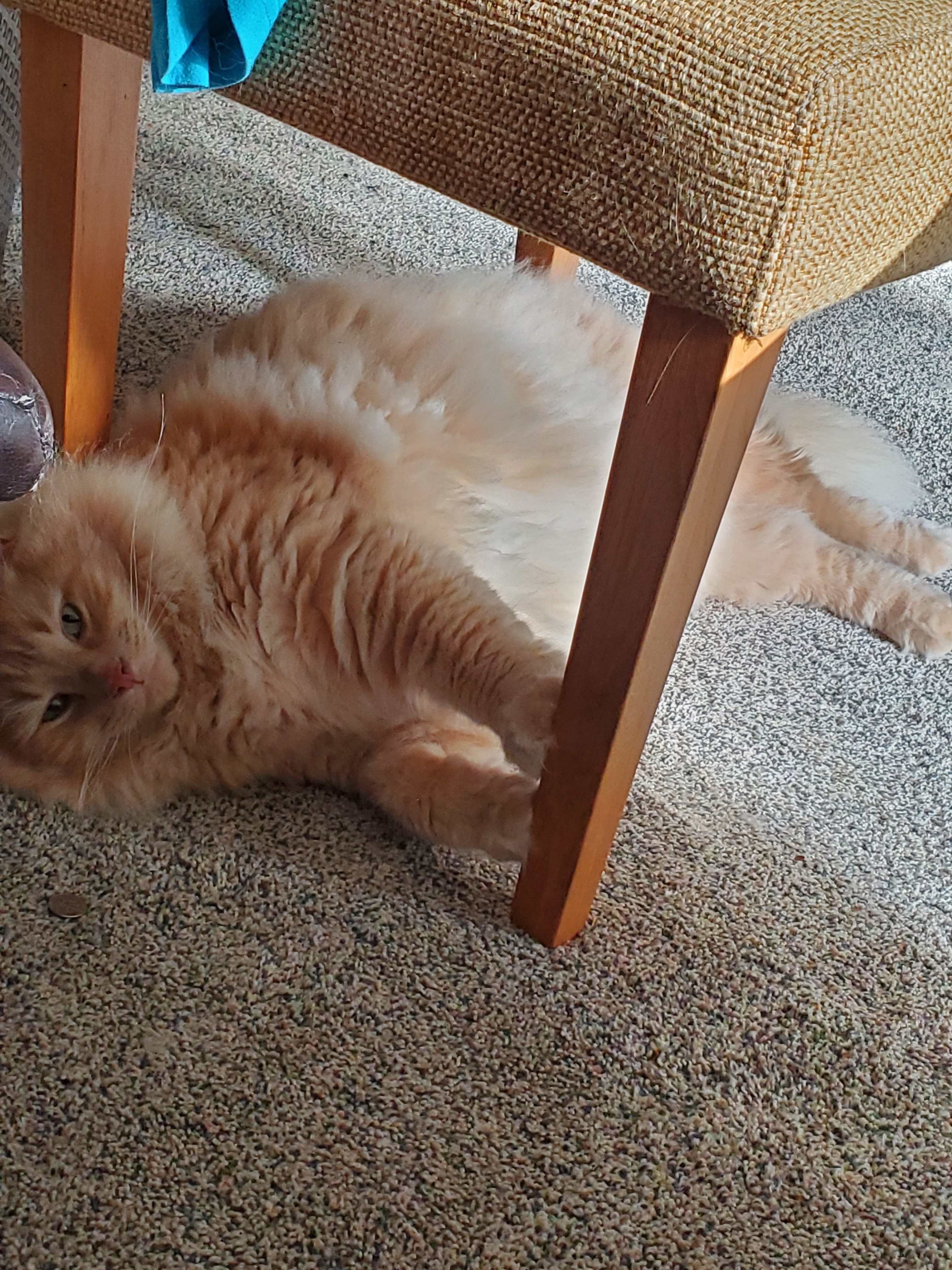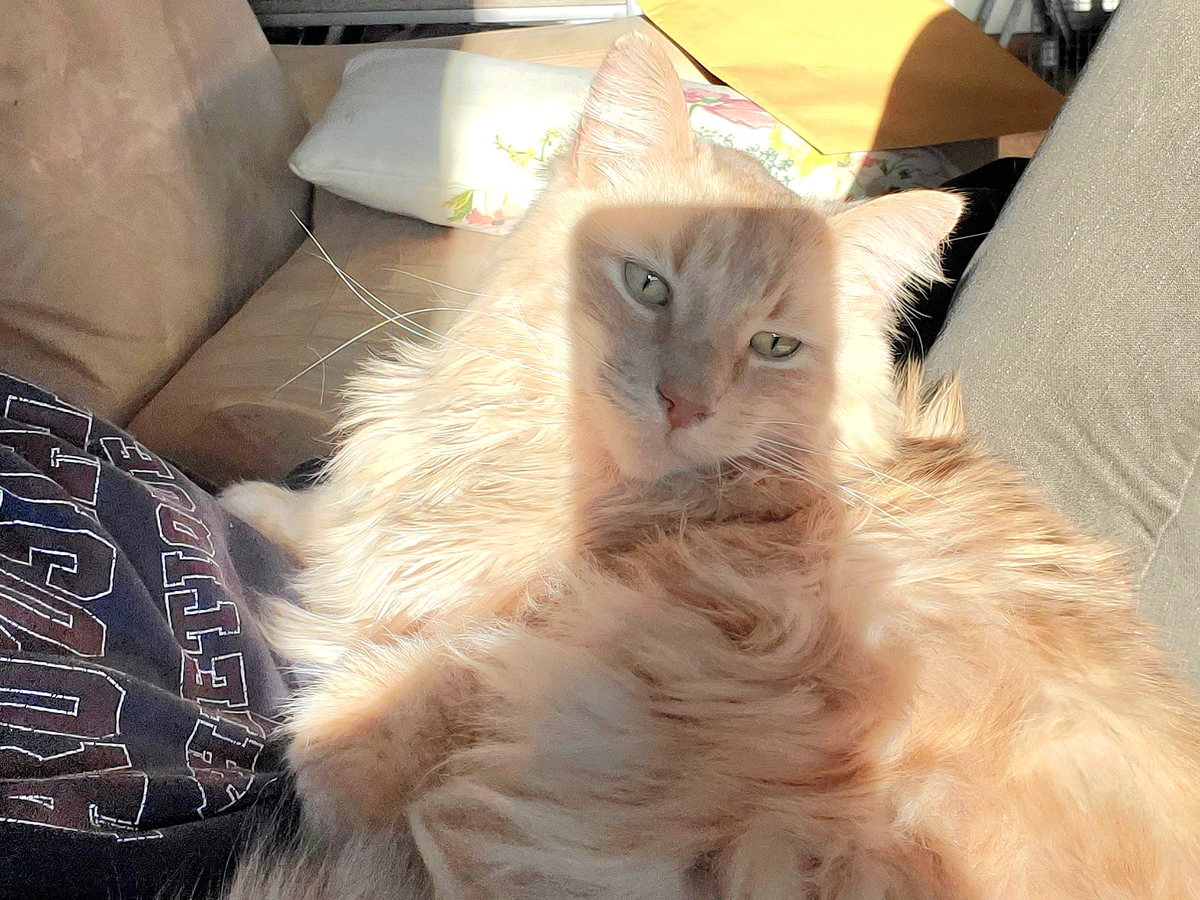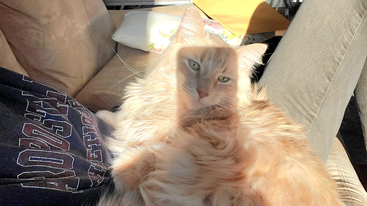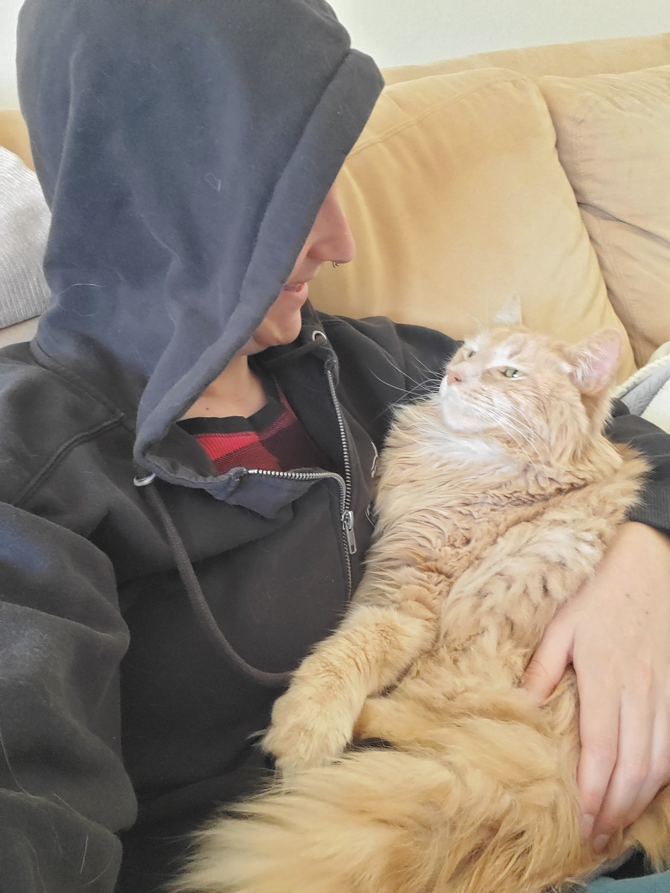 Goose is a very sassy cat. When he trusts you, he is one of the most tender cats I've ever met. He will hold your hand. He will hug your head and sleep with you all night long. He will sit on your lap and cuddle for hours. He will also get in his feels and dig his claws into your scalp! He feels a lot very deeply. He loves his routines and enjoys catching mice, sleeping in cardboard boxes and eating grass whenever he can.