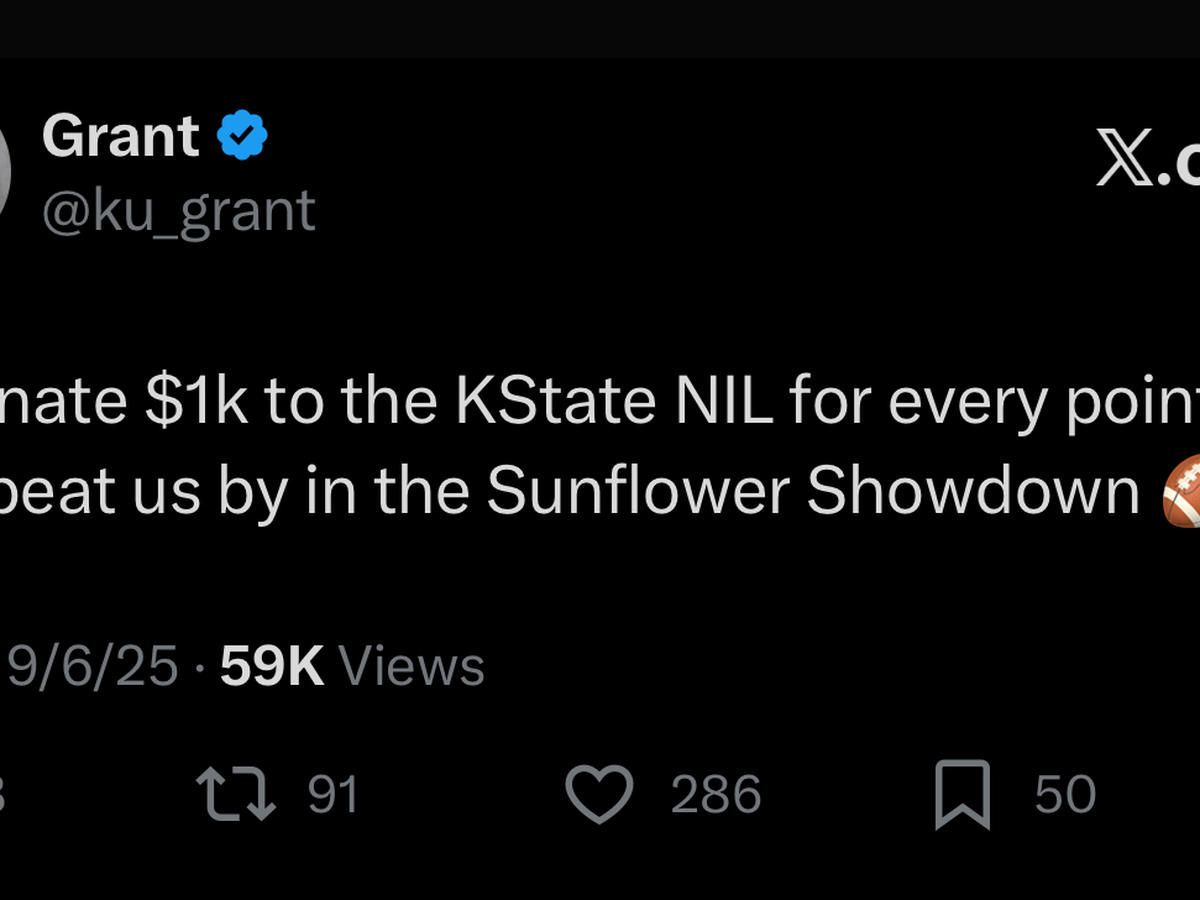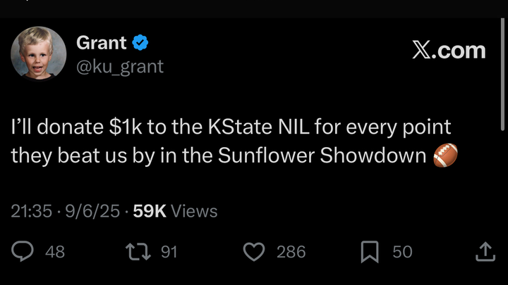 “I’ll donate $1k to the K-State NIL for every point they beat us by in the Sunflower Showdown.”