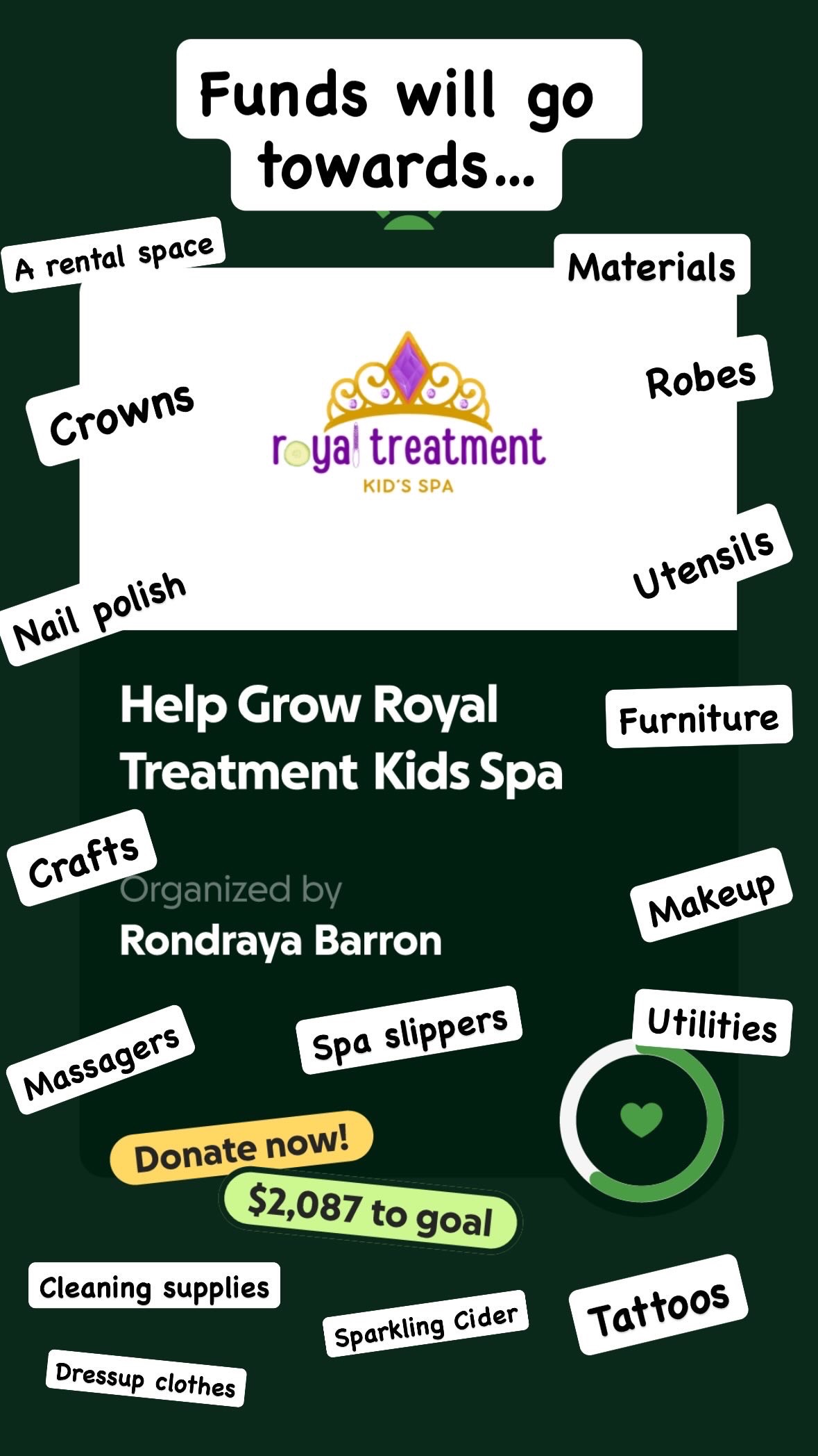 Starting a small business takes heart, hard work—and funding. I’m asking for your support to help cover the startup costs to establish Royal Treatment Kids Spa. Donations will go towards expenses including: