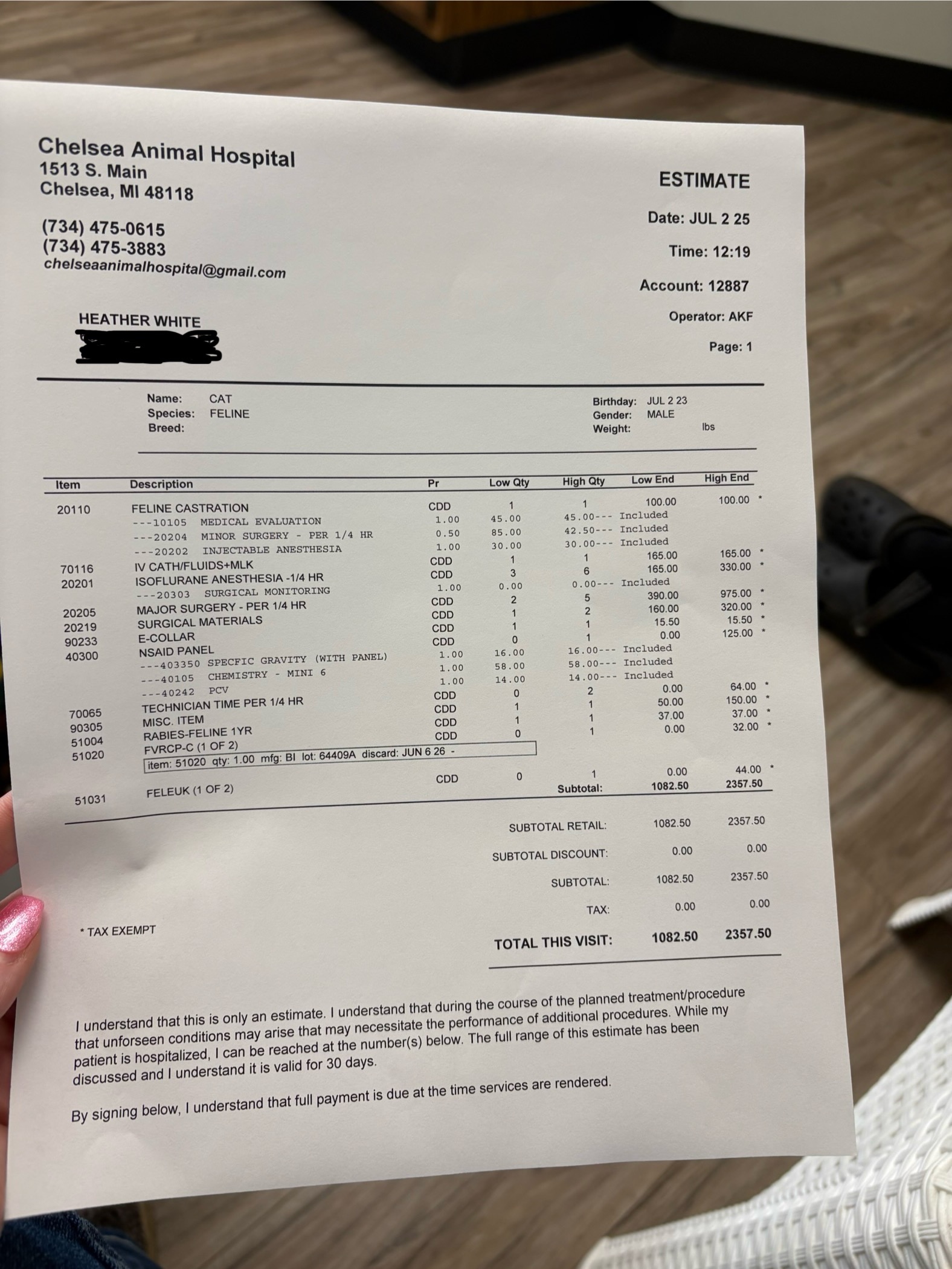 I attached the estimate below. You’re also welcome to call the vet to either verify or donate there too. Name is Heather White.