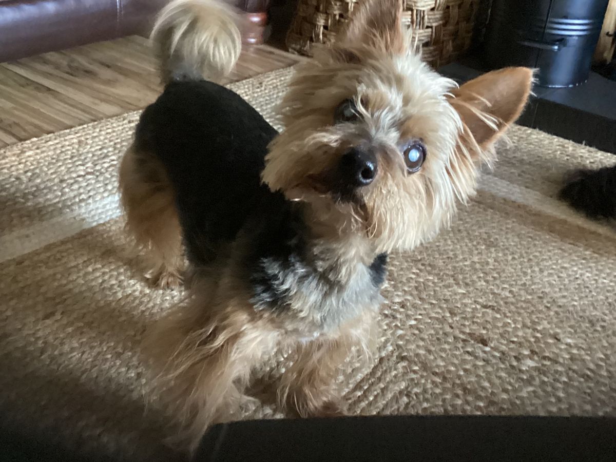 I can’t see, I pretend I do, cause I’m clever, I can smell everything, until it rains, then I worry about her, cause the silly cow can’t find me! She runs around with cat bells on her trainers, looking like an idiot, but what can I say, her fashion sense has never been great!