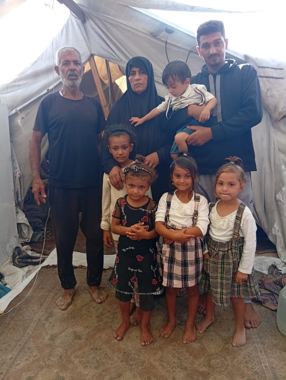 Currently, the entire family is displaced and living by the beach, in unsafe and unhealthy conditions. They are suffering from skin diseases, infections, and constant insects, especially flies. There is no clean water, no privacy, and no safety.