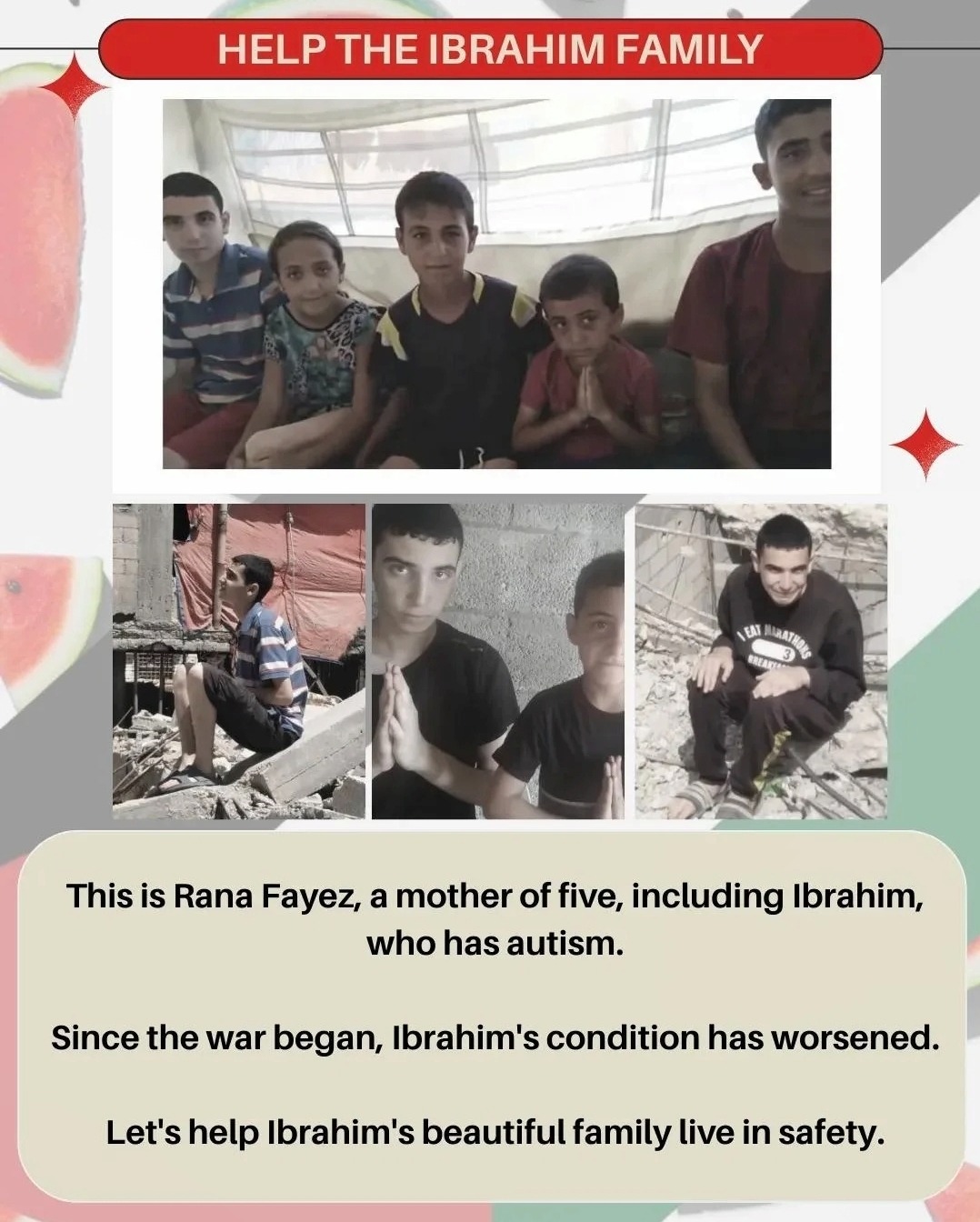 "I am Rana Fayez, a Mother of 5 children including Ibrahim who is severely autistic. Since the war, Ibrahim's condition has worsened. He puts his fingers in his ears, screams and cries intensely, fearing the bombing, loud noise and hunger.