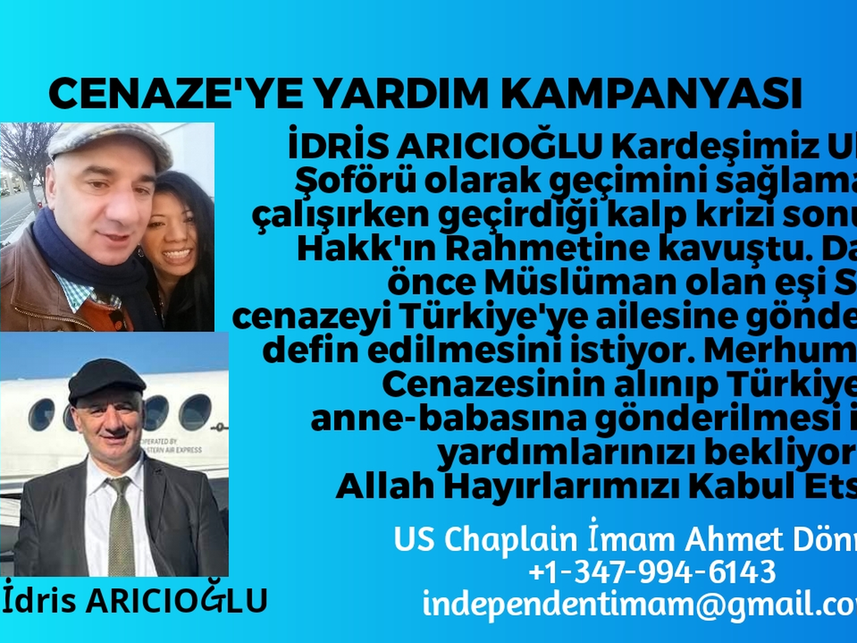 İDRİS ARICIOĞLU Kardeşimiz Uber Şoförü olarak geçimini sağlamaya çalışırken geçirdiği kalp krizi sonucu Hakk'ın Rahmetine kavuştu. Eşi Sara cenazeyi Türkiye'ye ailesine gönderip defin edilmesini istiyor. Merhum'un Cenazesinin alınıp Türkiye'ye anne-babasına gönderilmesi için yardımlarınızı bekliyoruz. Allah Hayırlarımızı Kabul Etsin inşallah.