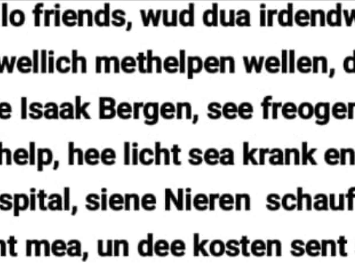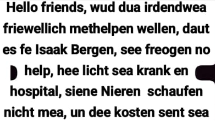 Dis gofund me es top gestalt fe Isaak Bergen Bolivia he es sea krank siene nieren schaufen nich mea in se freagen nu help tom de hospital bills betuln. Giera bet help . Wan du freagen has kas eare schwiadochta an anropen lisa Bergen 4327884556