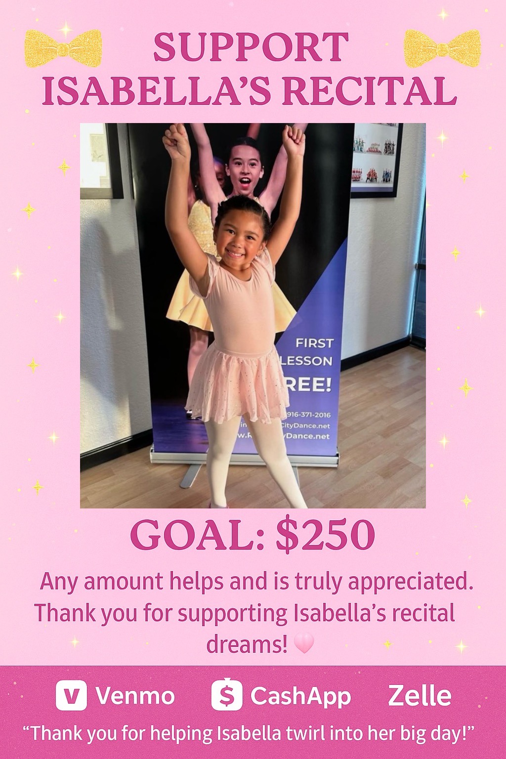 Hi everyone, we are raising funds to support my daughter Isabella for her upcoming dance recital. She has been working so hard and absolutely loves ballet — it’s something that truly brings her joy and confidence.