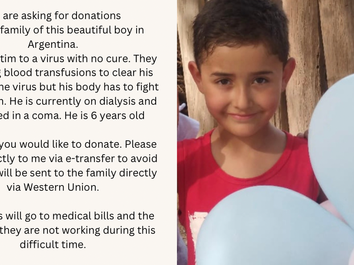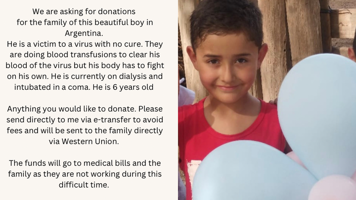I’m Jessica, my husbands nephew in Argentina is victim to a virus that has no cure. He is currently intubated and on dialysis. We are asking for fund to send to the family to help with medical bills and help the family while they cannot work during this time. I appreciate anything you can send their way. We will be sending funds via western union on Friday December 6th.
