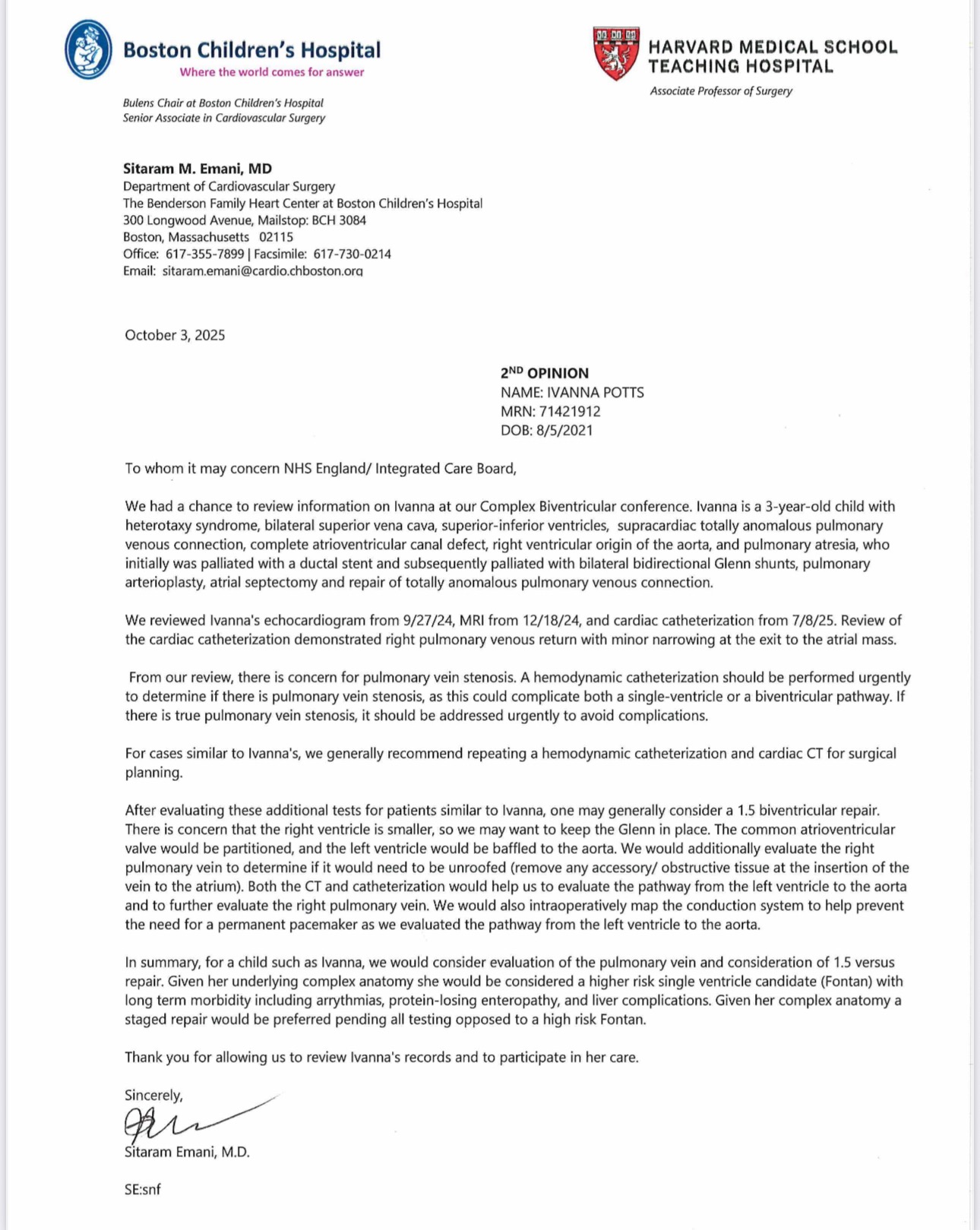 Boston have expressed concern about Ivanna proceeding with a Fontan, as they are concerned about the outcome given her anatomy and investigatory findings.
