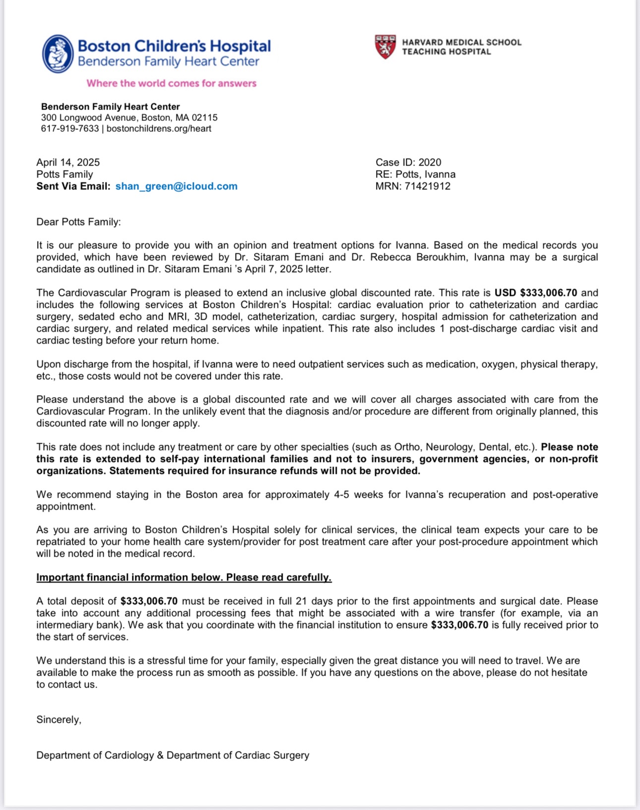 Getting Ivanna to America requires significant funding. Boston have provided a financial estimate of $333,000 (around £250,000) to cover surgery, hospital care, travel, and essential treatment.
