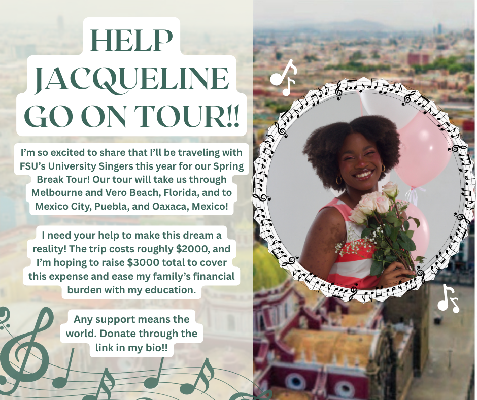 Hey yall! I’m Jacqueline Jenkins, and I’m so excited to share that I’ll be traveling with FSU’s University Singers this year for our Spring Break Tour! Our tour will take us through Melbourne and Vero Beach, Florida, and to Mexico City, Puebla, and Oaxaca, Mexico!