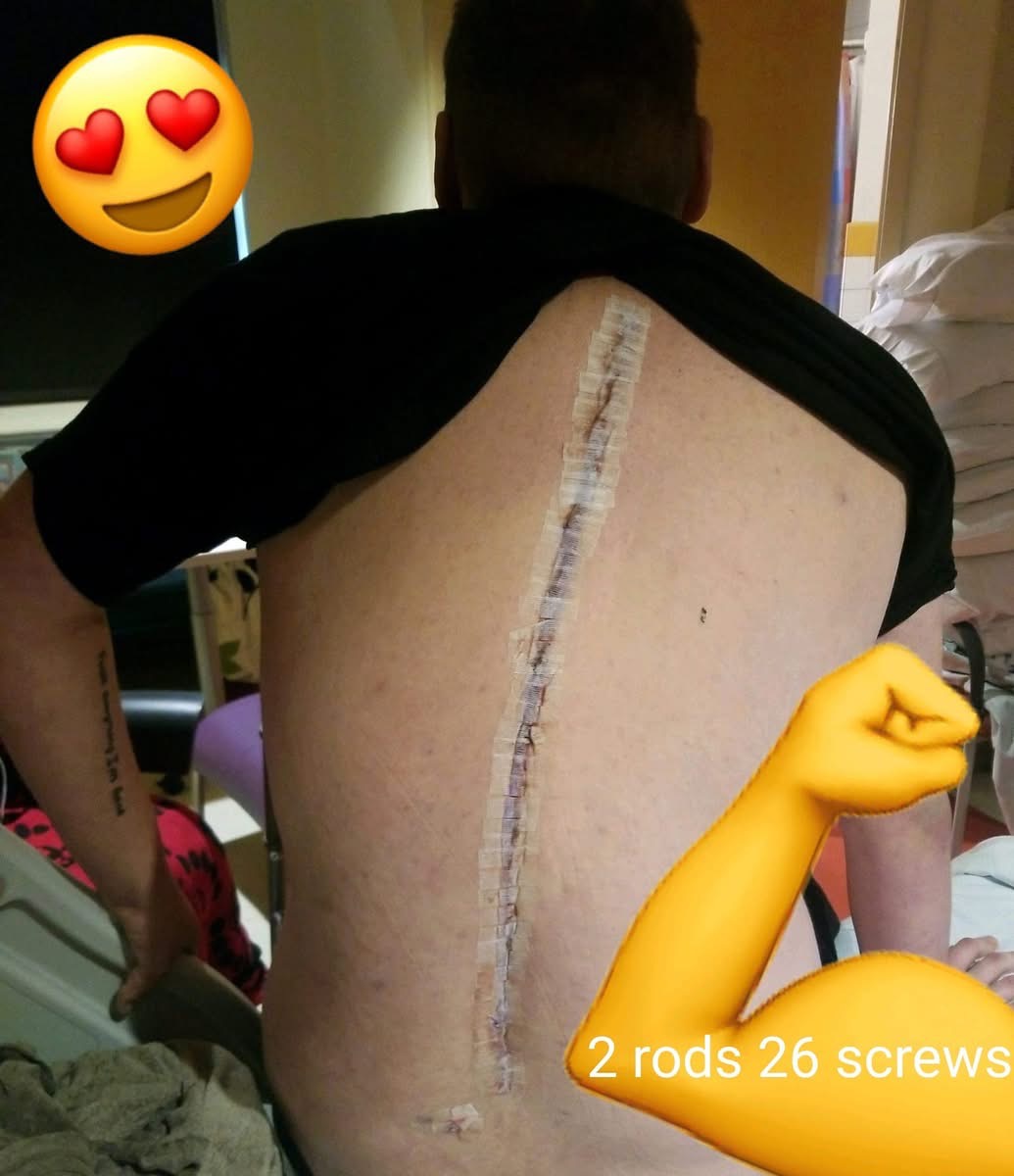 He’s currently in the hospital again. He couldn’t walk again and was in agony. In a few days the remaining vertebrae below his rods will all be fused. Making his entire spine covered in rods and screws. He’s not going to be able to walk afterwards.