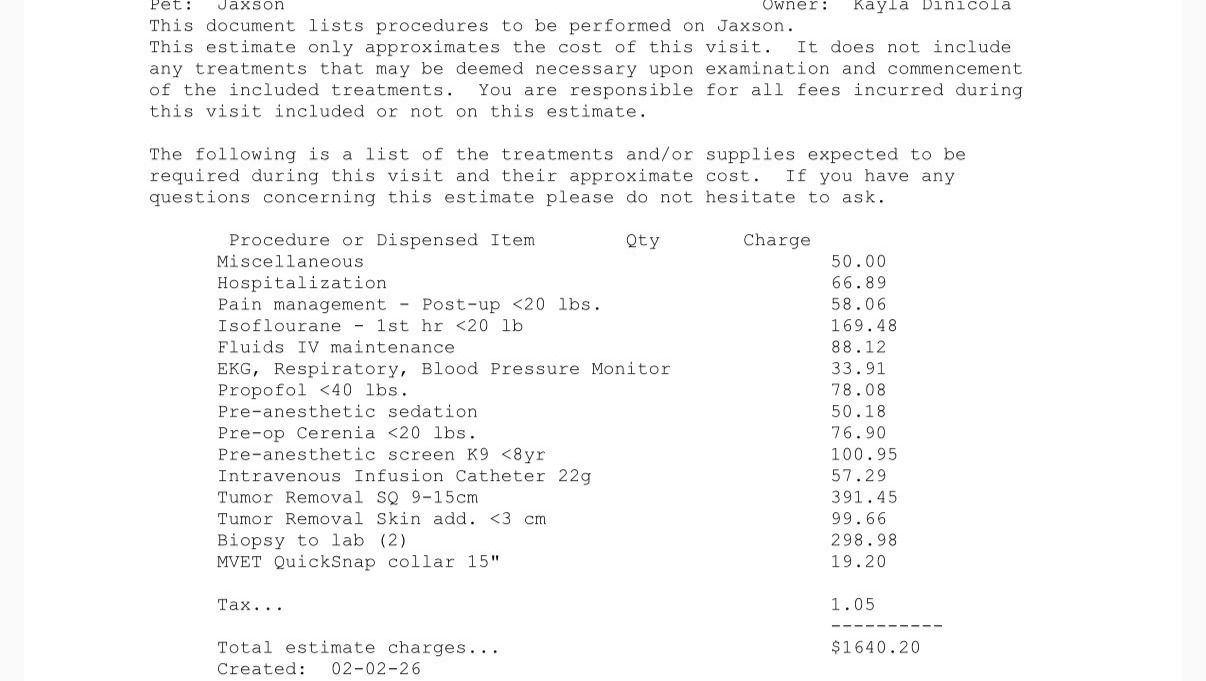 Greetings, My name is Jax. Im trying to raise funds for an emergency surgery I need to have. I have a large tumor on my left side that I need to have removed as soon as possible and biopsied for Cancer. Doc says its starting to encroach upon my armpit in the front and could also lead to amputation if not taken care of in a timely manner. After recent events of having lost my sister 3 months ago, we are extremely worried about my well being now that Im almost 11. We are still trying to pay off some of my sisters medical bills, leaving us needing a little extra help. Any bit helps, as I are scheduled to have surgery as soon as Early March. Pictured below is a copy of the estimate from the vet and photos of my Lump.