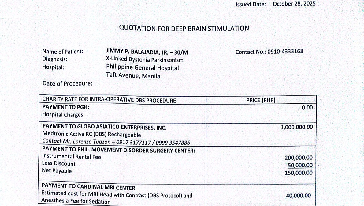 While there is no known cure yet for XDP, Jimmy’s doctor has recommended Deep Brain Stimulation (DBS) surgery, a critical procedure proven to help people with movement disorders regain some control of their muscle movements. This involves placing electrodes in specific areas of the brain to help regulate motor function. It could give Jimmy a chance to move more freely again and greatly improve his quality of life.