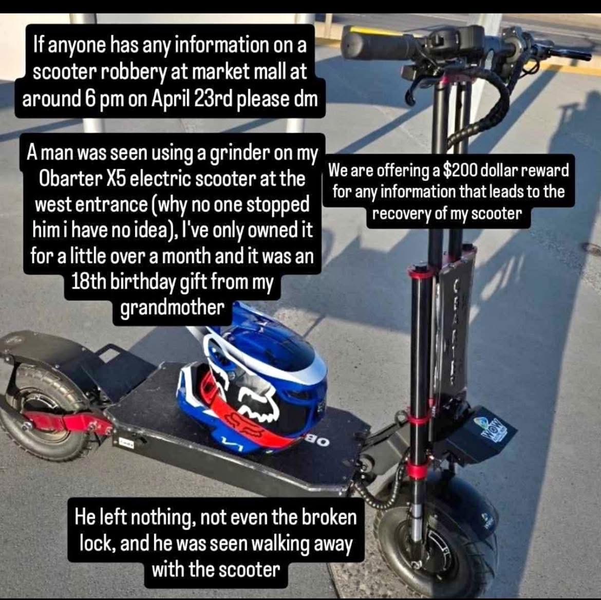 I’m reaching out to ask for your support for my nephew Joe. Just a few weeks ago, he received an electric scooter for his 18th birthday. It gave him freedom, independence, and a way to get around on his own. That much needed freedom was taken from him when someone came in broad daylight, grinded off his lock, and stole the scooter.