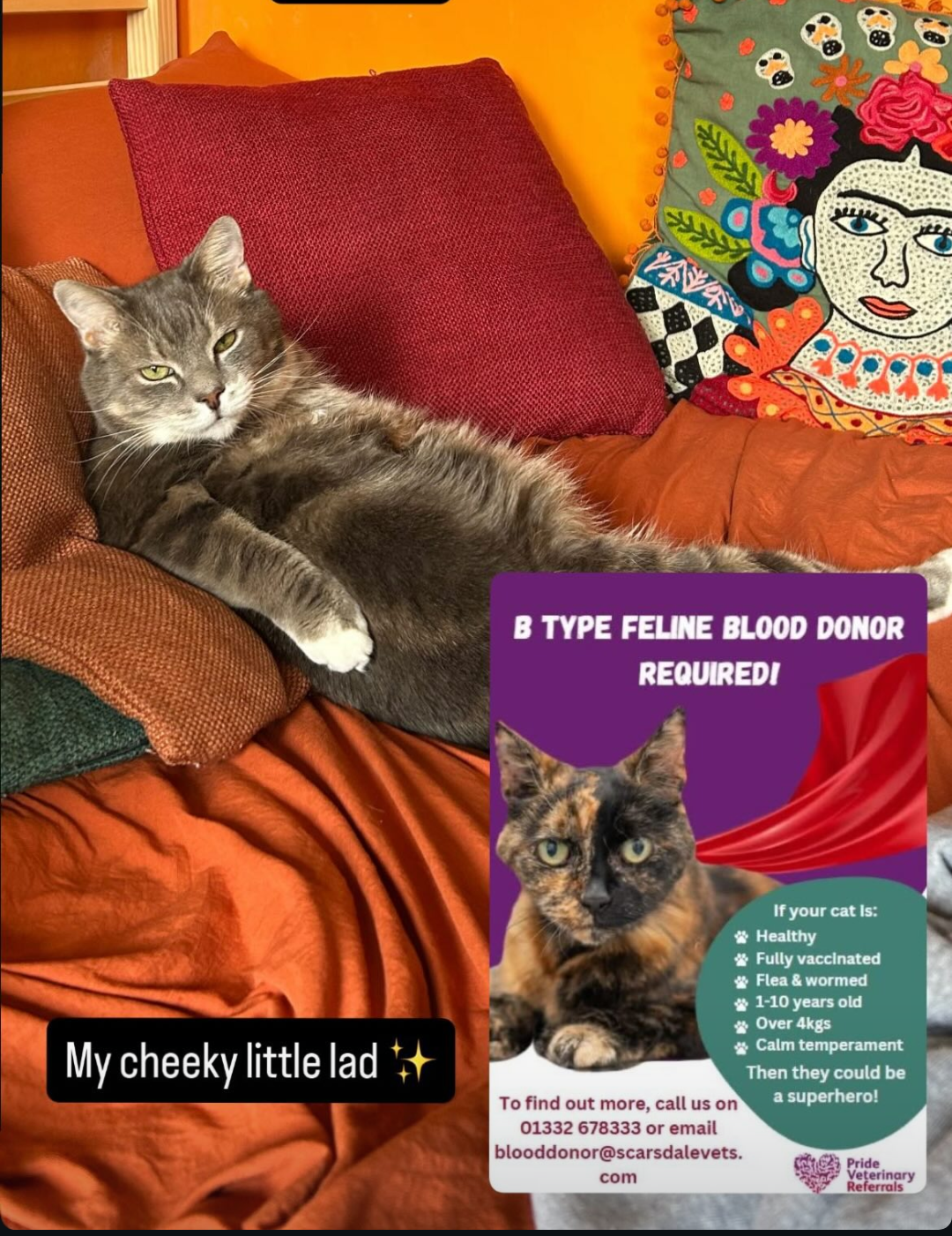 Even if you are not able to donate, we would be so thankful if you could share this page with others. You could also help by registering your healthy cat with the Scarsdale Vets cat donor registry in Derby, especially if they are Type B. Your cat could one day become a superhero for another in need.