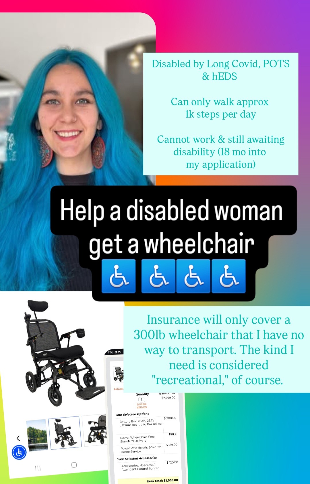 Hi, I'm Joy. I'm disabled by Long Covid, POTS, CPTSD & hEDS. I got Covid in August of 23' and my life has never been the same. I went from owning and operating a regenerative flower farm and plant nursery to being nearly bedridden. After 1.5 years of battling to get the proper diagnosis, I am doing slightly better, but can only walk very short distances before my heart rate spikes into tachycardia. I miss the world, people, nature, plants. A wheelchair like this would allow me to leave my house without jeopardizing my health.