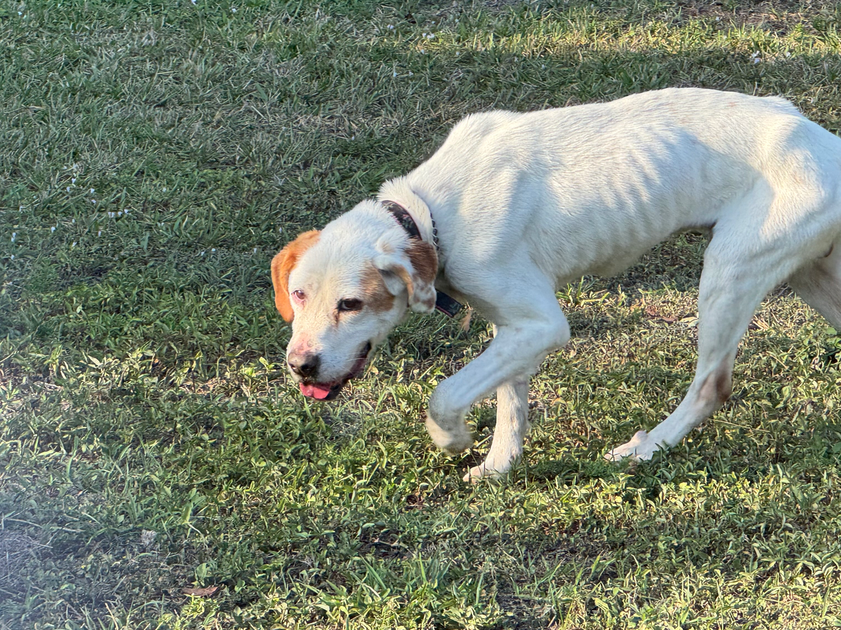 This poor dog was chained, padlocked, starved & dehydrated. So I had to get him out of that situation. Photos are a progression of events. Now here with us as u can see. I paid for an interstate transporter to get him here to Fl. We left him with an emergency vet here in FL, where he stayed for about 8 hours in intensive care which cost $48/hr. I hurried up and turned back around & got him once I knew he was not contagious except through blood so as not to infect our other dogs . He is heartworm +. The vet has him on a regular wormer too just to make sure since most likely he has intestinal parasites as well. His gut when X-ray’ed showed it was full of sand, what he was eating to feel full! What kind of people do this to an animal!