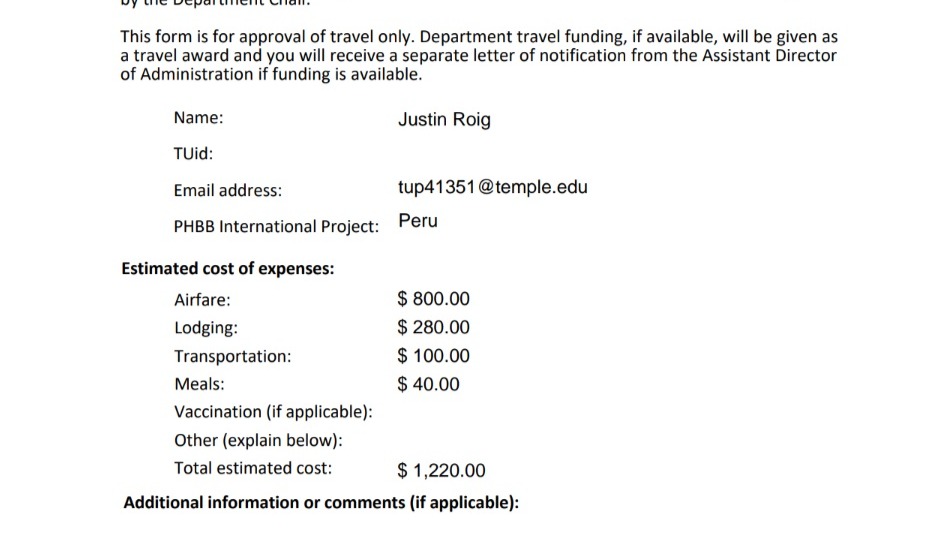 We are traveling this June, but are purchasing the tickets now due to the rising cost of airfare in recent weeks. The flight roundtrip will cost circa $780-$800. The estimated costs can be seen in this screenshot from my travel form below.