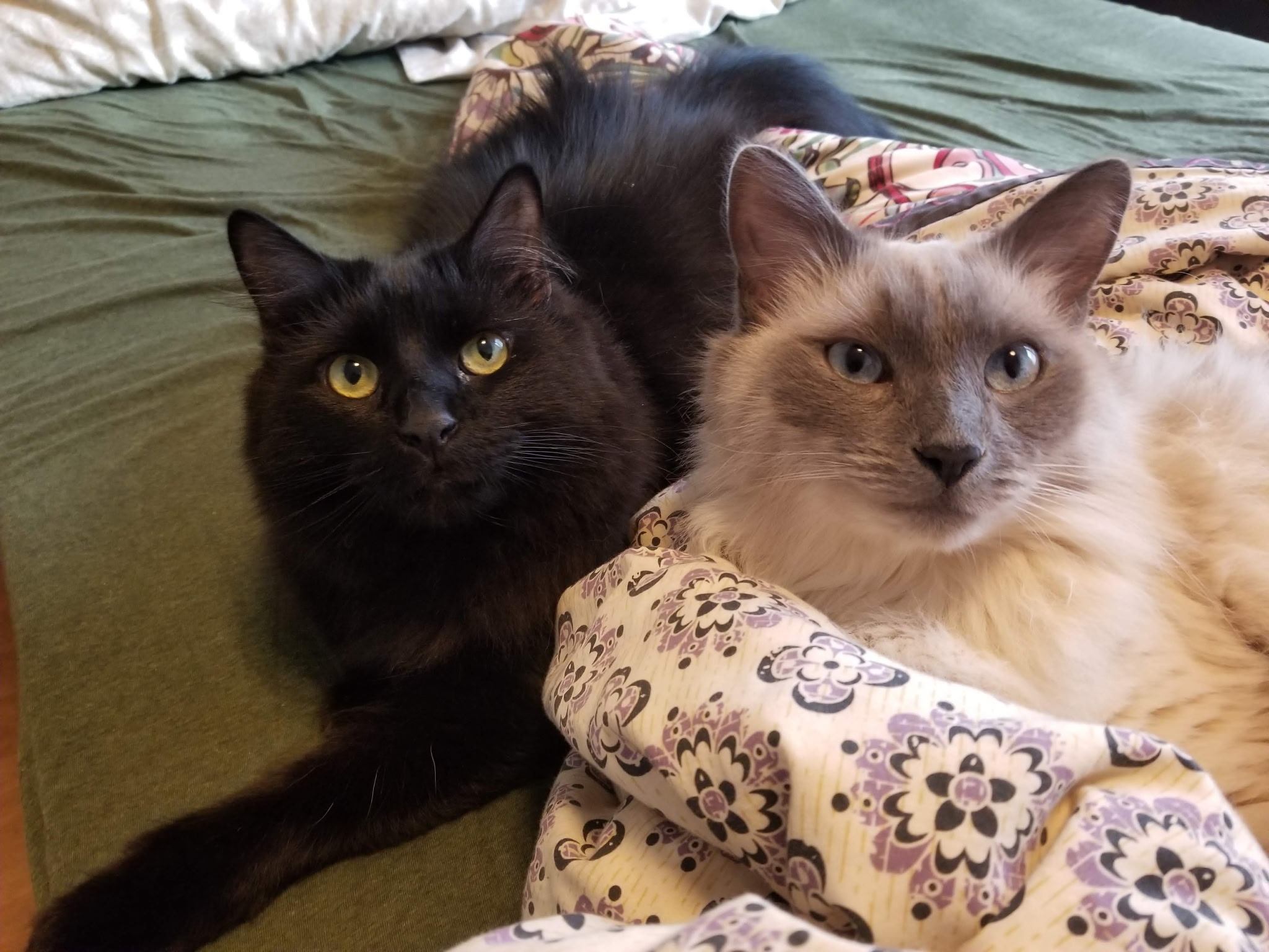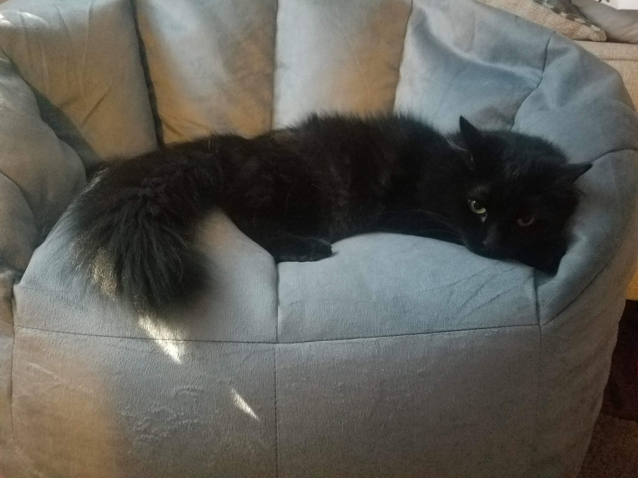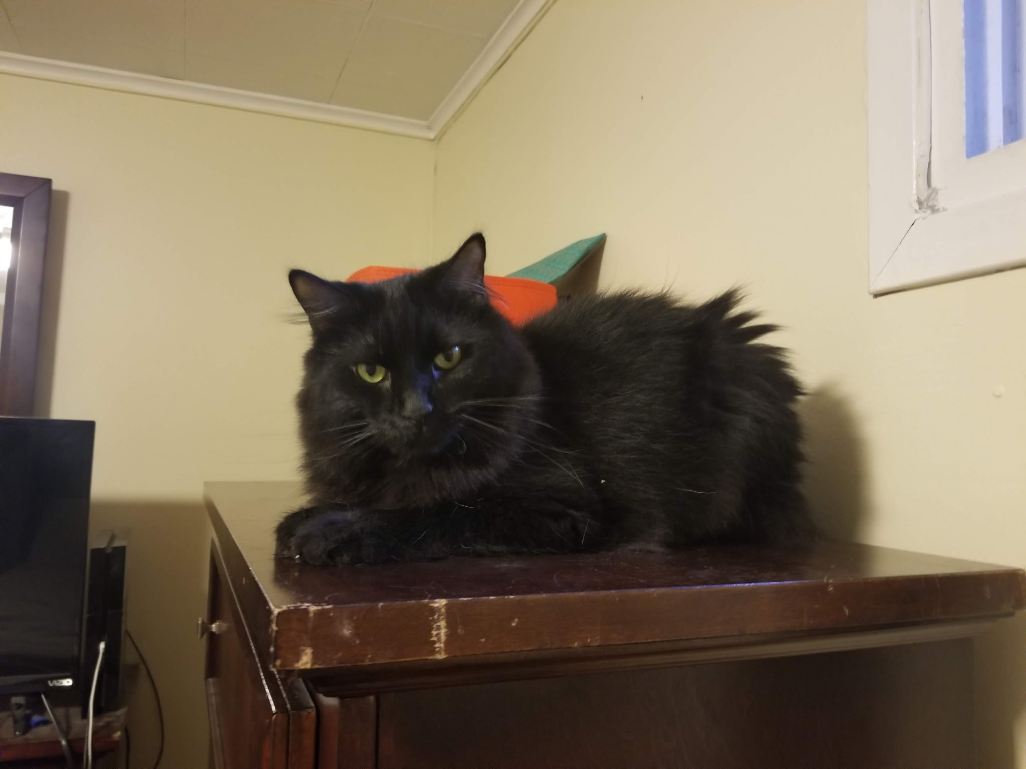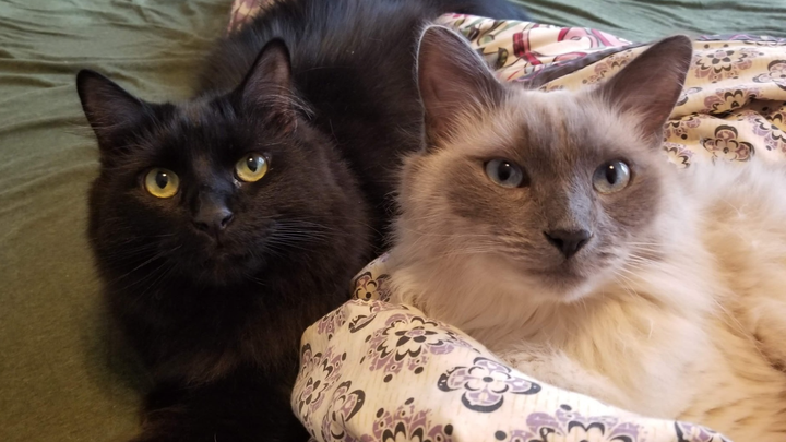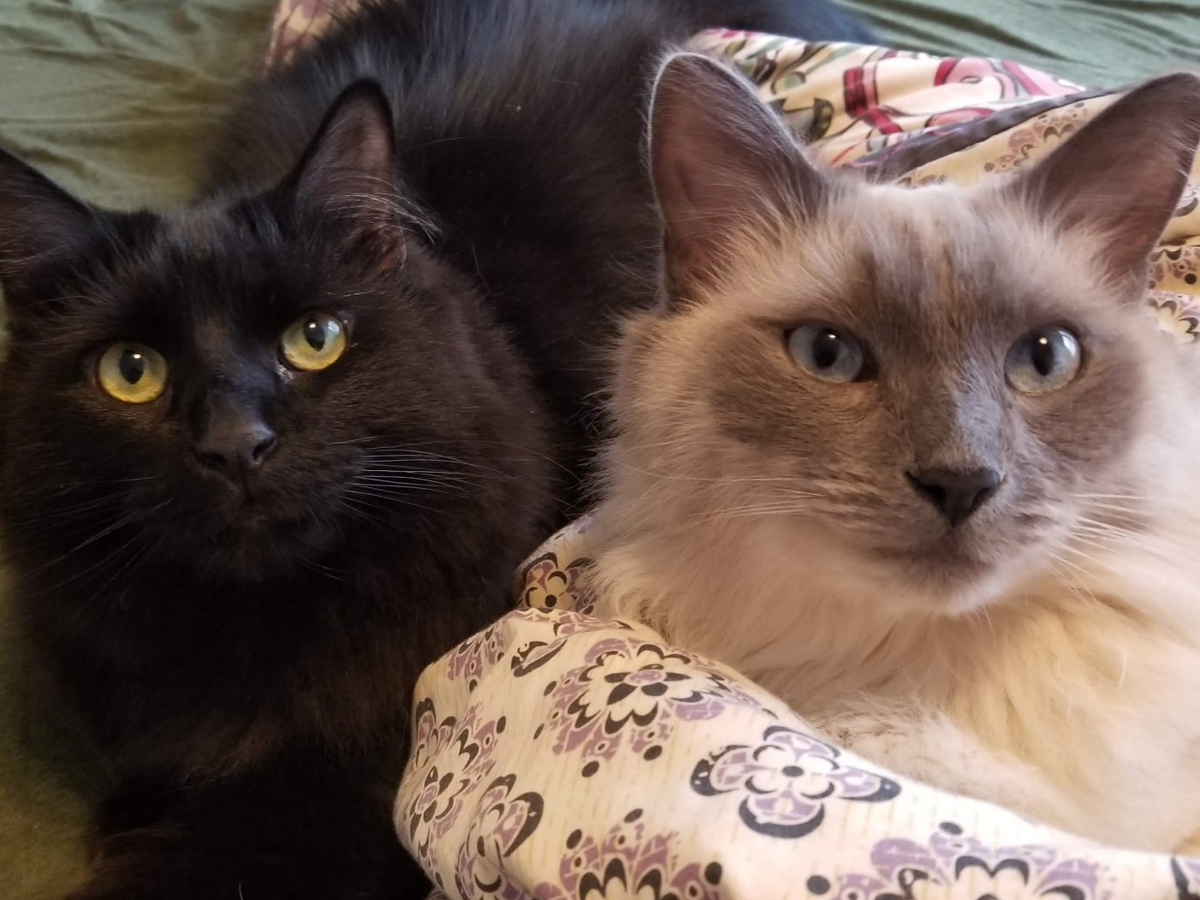 Kai is our long haired black cat, and my boyfriend and I adopted him as a kitten about eight years ago. He’s always been a timid little guy—my sweet scaredy cat. While he’s shy around adults and usually hides, he loves to play with kids and snuggle with me. Kai has brought so much joy and comfort to our home, and we can’t imagine life without him.