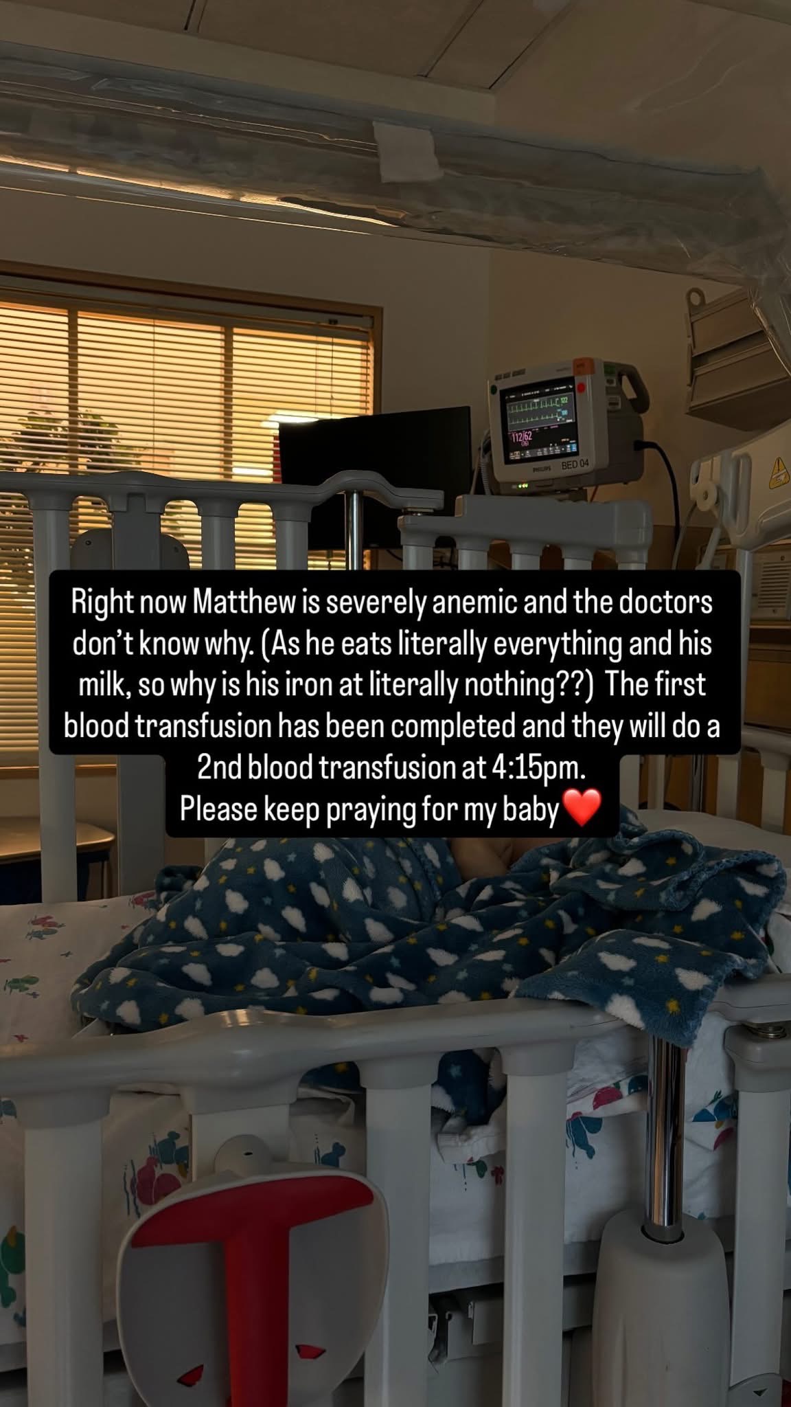 He was also placed on a heart monitor for abnormal rhythms. He received a second transfusion, and it looks like more are to come, as his iron levels are not increasing, and they don’t know why. His hospital stay is uncertain at this point.