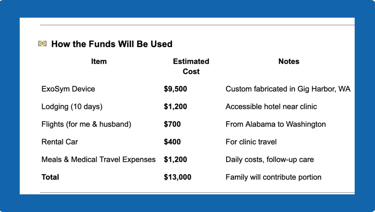 We are fundraising to cover the travel, fitting, and rehabilitation costs of the ExoSym so I can stay present in my family’s lives, continue my work helping others, and reclaim the simple, extraordinary gift of living fully again.