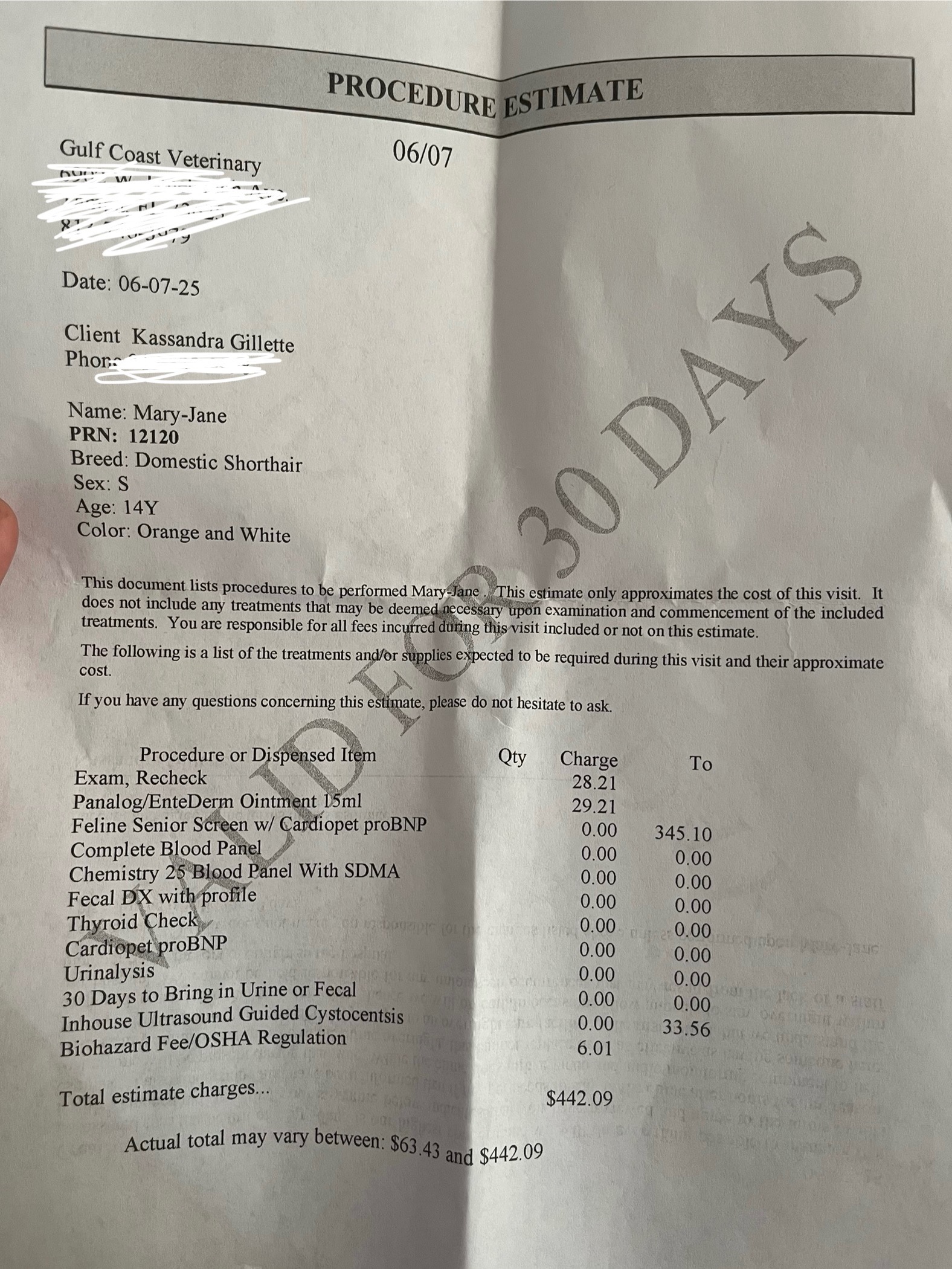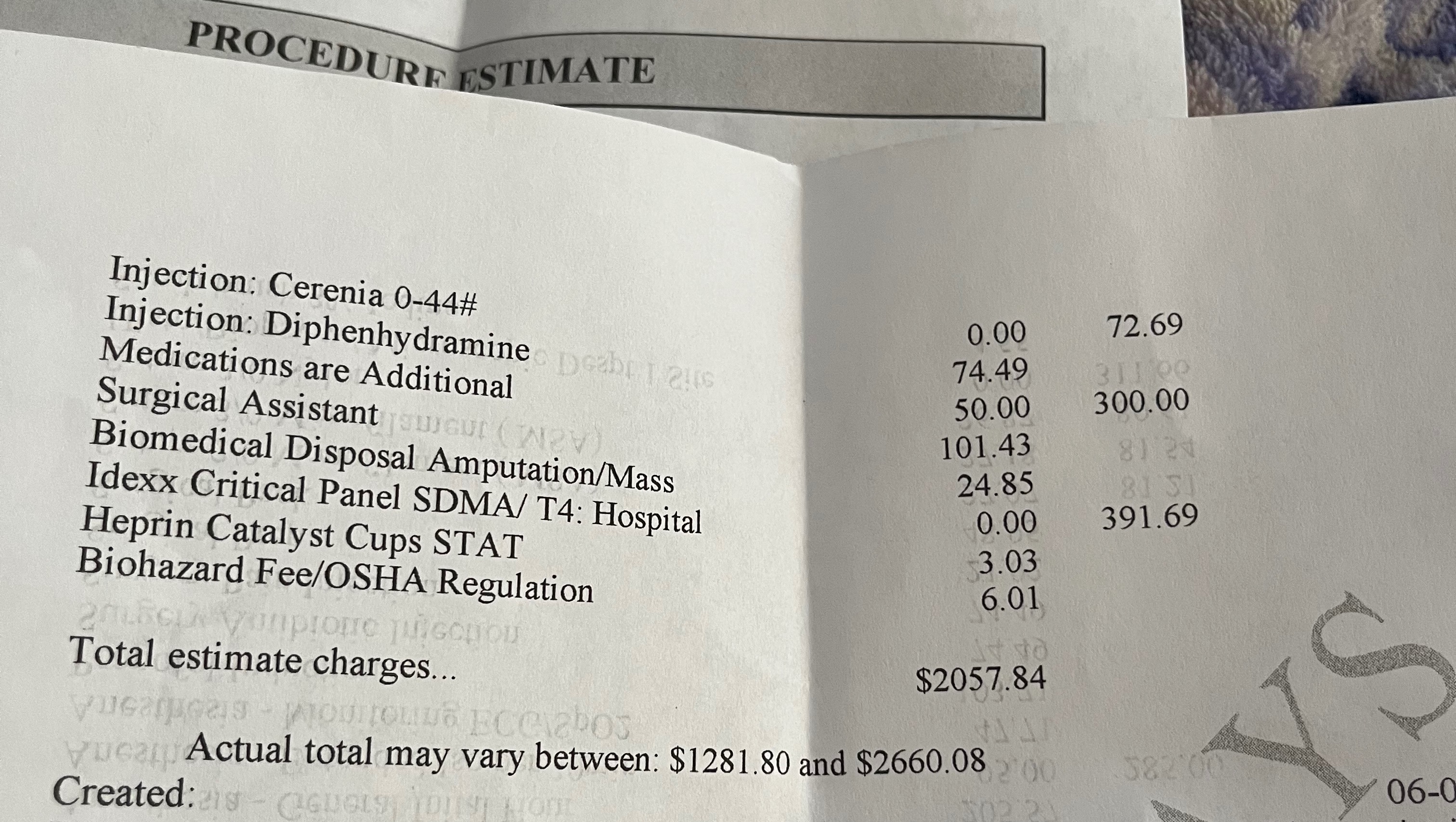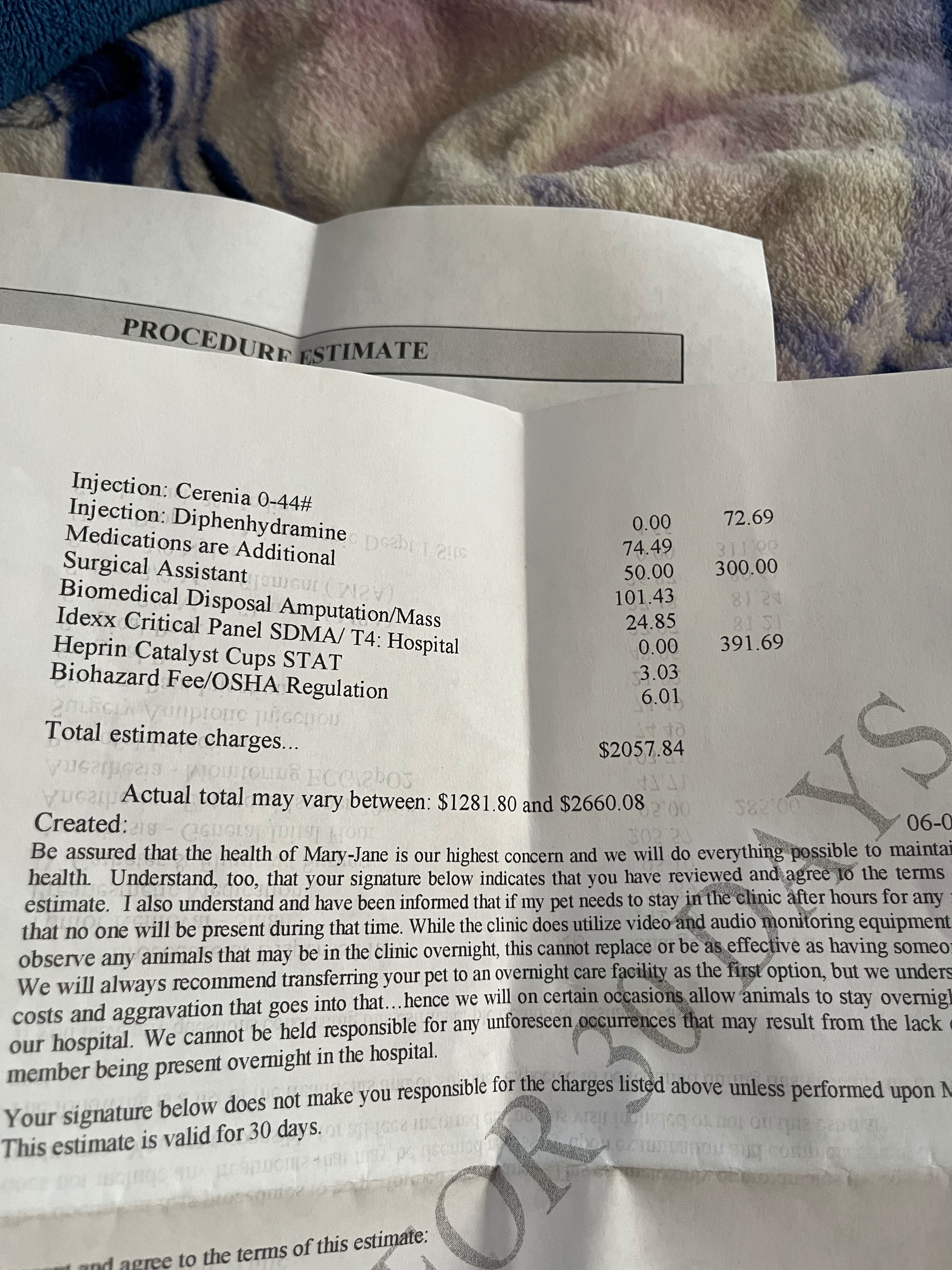 I have reached out to multiple vets to get an estimate and on the low end it’ll be 1400- 3000 as an estimate. Unfortunately I can’t get an exact cost til after the surgery is over.