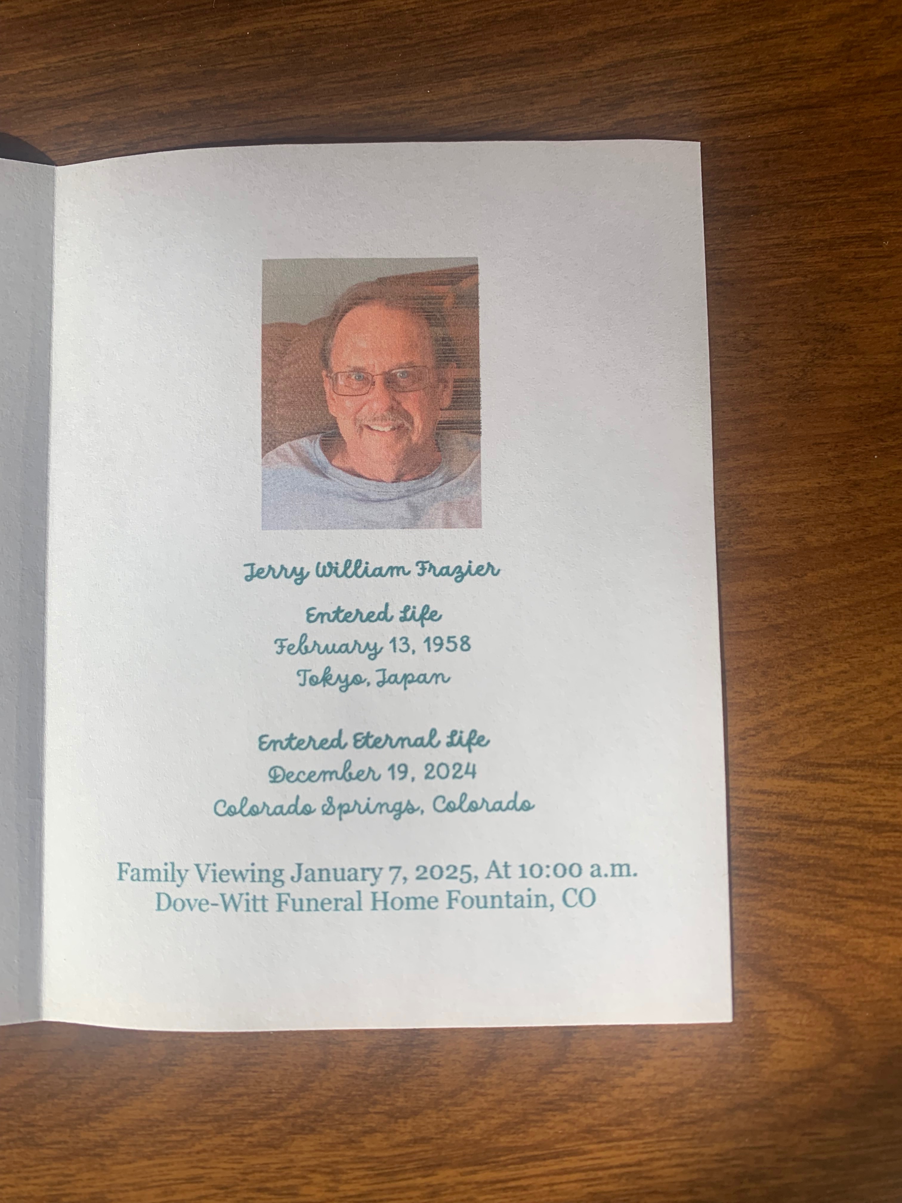 When I met at Dove Witt to get paperwork for service etc. set up, I was still unable to get this done because the coroner’s office only allowed pick-ups between 11 a.m. and 3 p.m. and wasn’t sure they would be able to get Jerry that day but would do their best. He did call me at 4:26 p.m. to let me know they were able to pick up Jerry and his care team was going to let him know if we could have a viewing.