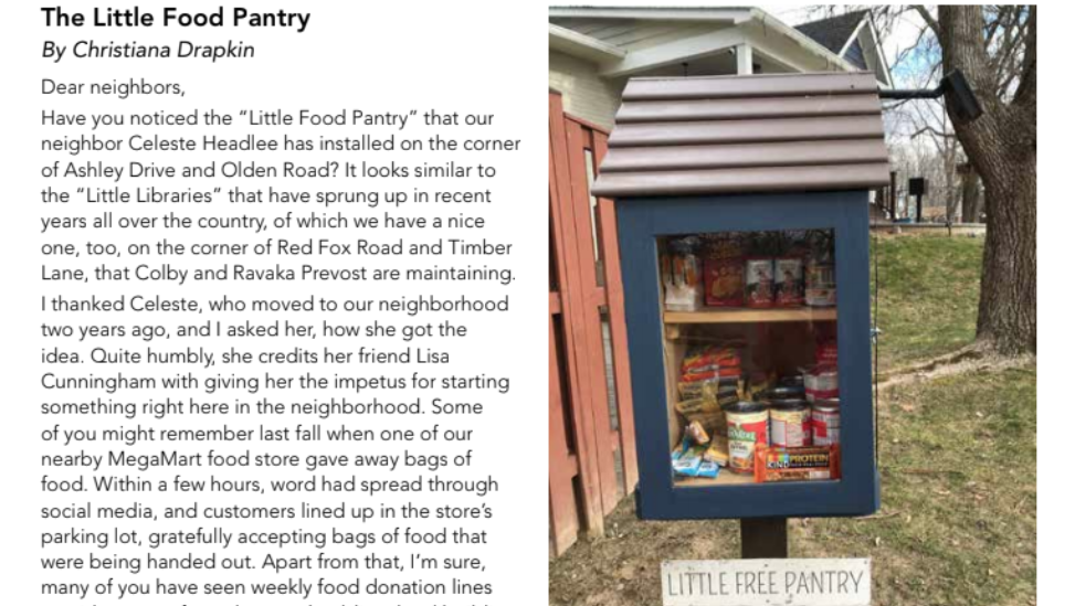 In 2021, my neighbors and I installed a little free pantry on my front lawn, as so many people in our city had lost their jobs and needed help. Food banks are wonderful, but they often ask people for their names and other identifying information that some are reluctant to give. We have a diverse neighborhood including people of all income levels. Not everyone was able to weather the financial storm.