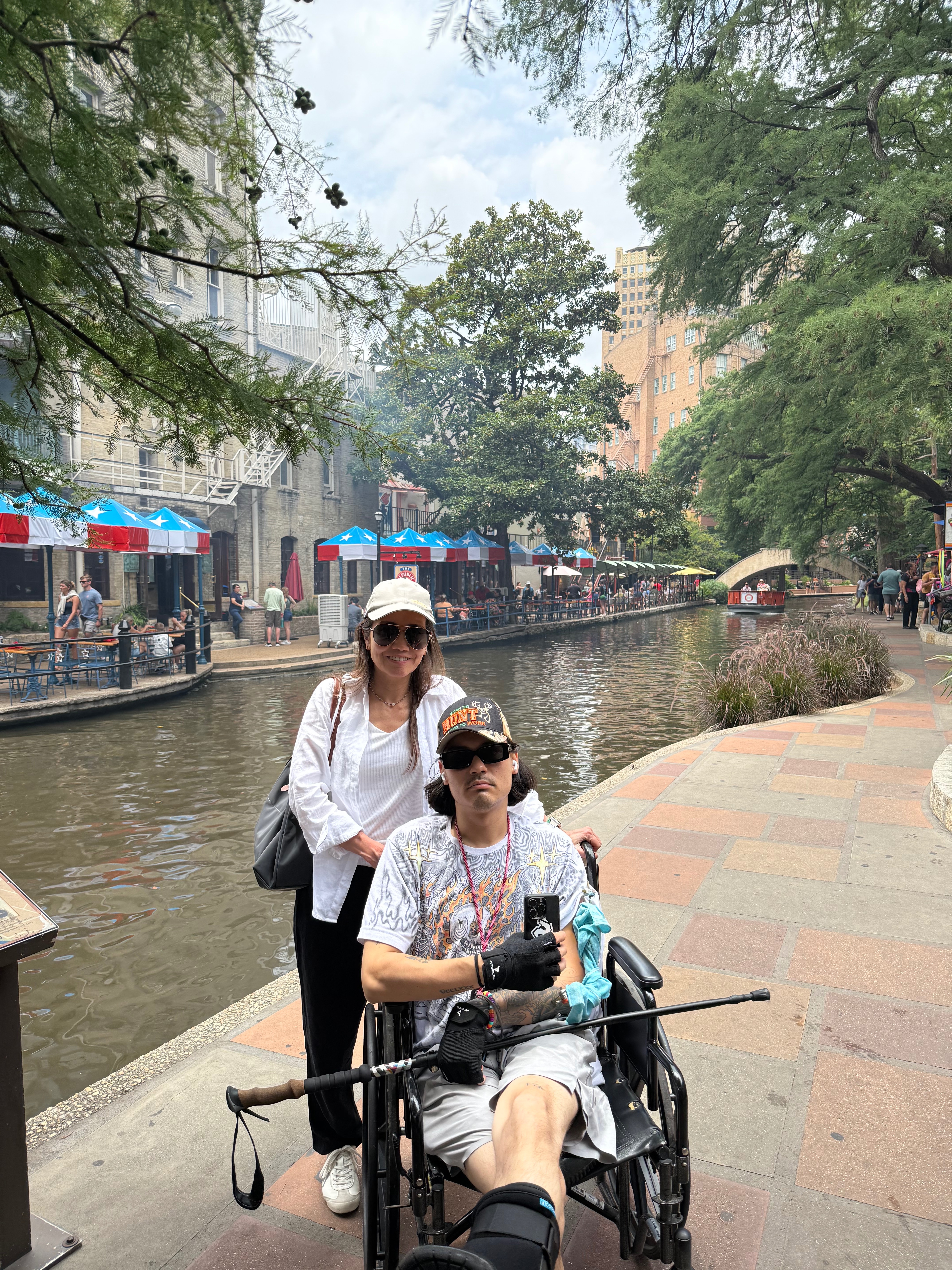 Kevin and me by the San Antonio Riverwalk — his first outing in a wheelchair, building strength one day at a time.