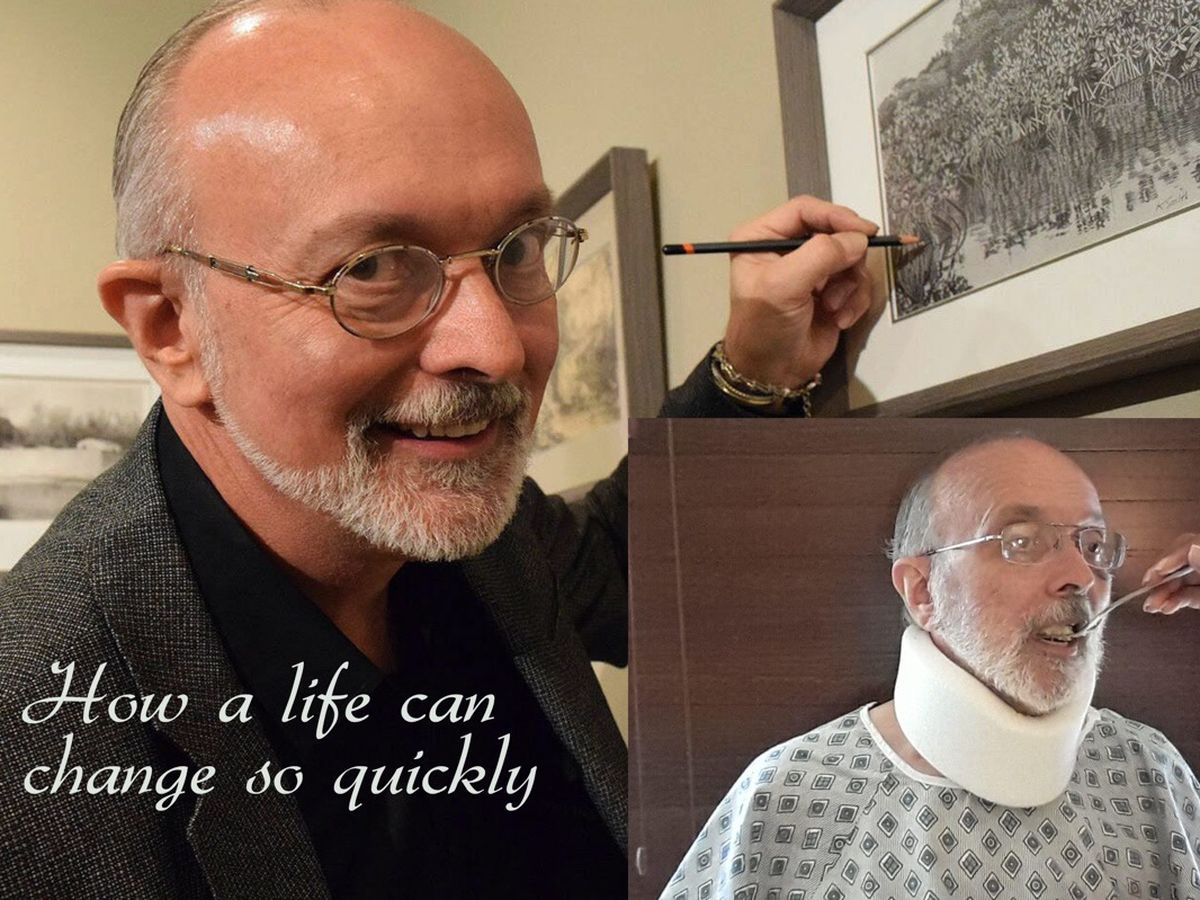 Well known Bahamian based colour pencil artist, Kim Smith, suffered a freak accident whilst walking on Tuesday June 2, 2020. He tripped and fell, hitting his chin on the pavement causing pressure on his spinal cord because of disk protrusions in his neck. Due to the severity of the injury, this has caused Kim to have very limited function in his arms and legs. It is uncertain at this point how much recovery he will have and whether Kim will require surgery for his neck. He is now at home with special equipment, nursing care and therapy. He has to wear the neck brace until his video conference with the neurosurgeon on June 29, where the need for surgery will be discussed.