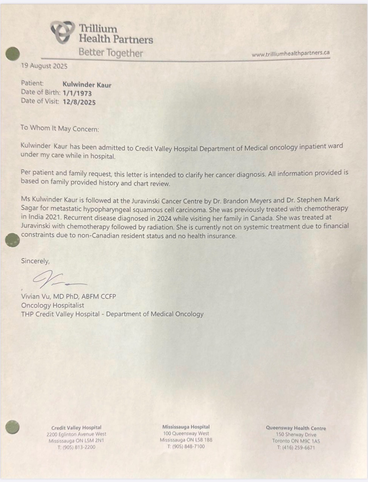 She first went through chemotherapy in India for 2.5 years continuously. Once she got better, she came to Canada to live with us and visit her newborn granddaughter. After about 1.5 years, the cancer came back in full force. Her insurance didnt cover the expense. We paid out of pocket for her immunotherapy and radiation. It was a huge expense, we had to sell our primary home, our rental homes and our vehicles to cover the expense.