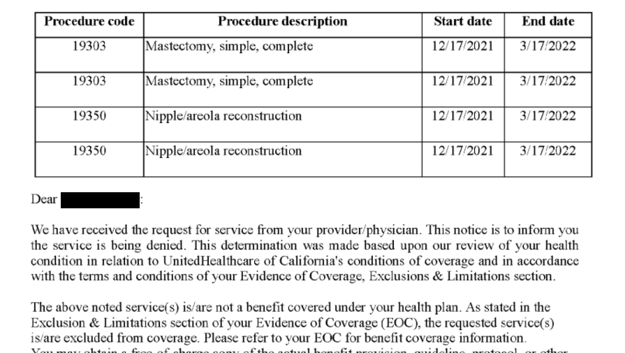 Back in April 2021, when I was first trying to get this taken care of, my doctors and insurance told me there were no in-network plastic surgeons that would be able to go to for this, and that I should look out of network. In June, after my consultation with my surgeon's office, United Healthcare told me that they had received my letters of support from my therapist and my referral from my doctor to this out-of-network surgeon. I've called them multiple times between June and November, and each time they assured me that my case had been accepted and closed, and I was on track to get my top surgery completed on December 17th, 2021.
