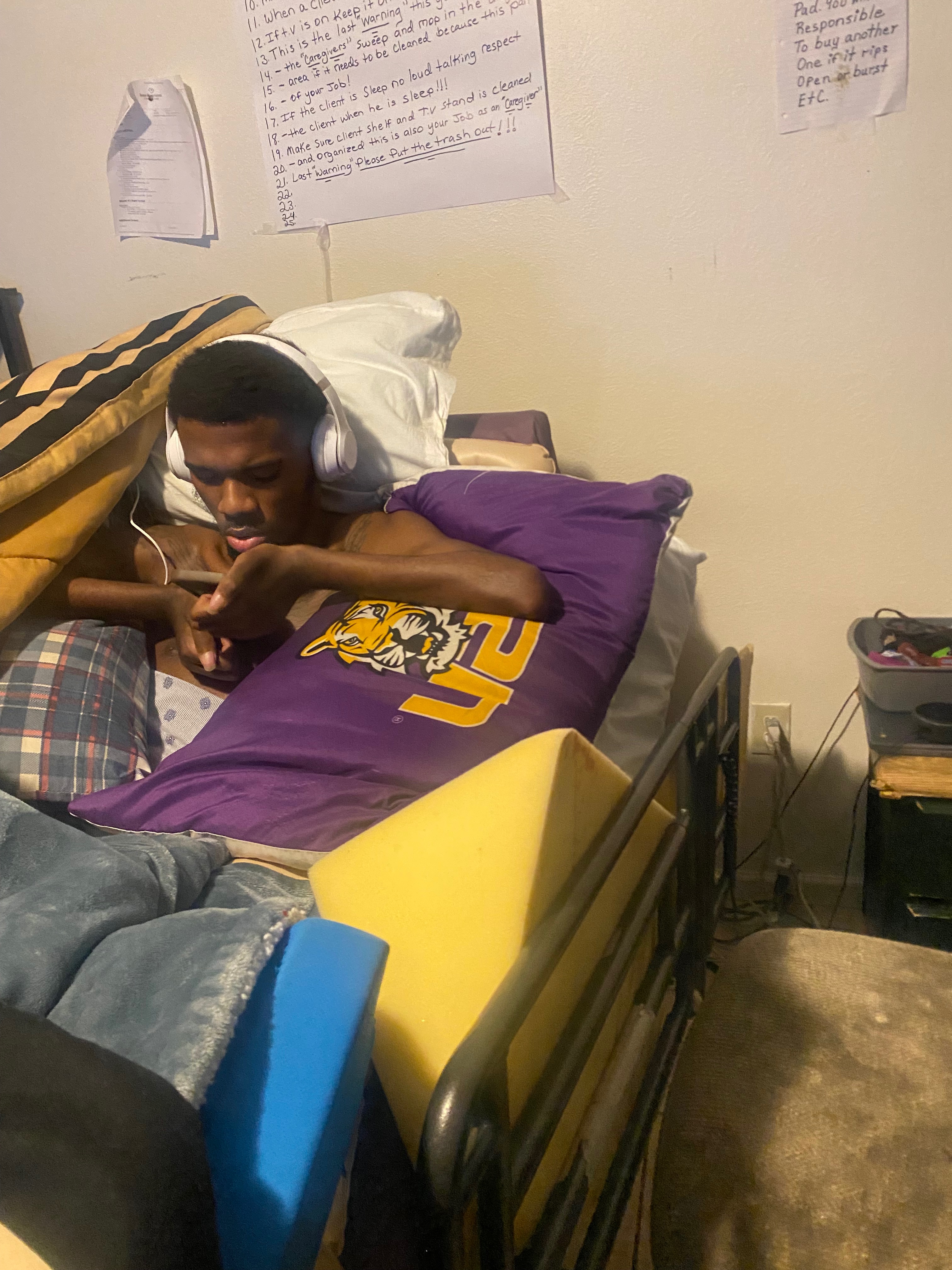 As you can see in the photo, he currently lies in a makeshift setup — surrounded by pillows and foam, doing his best to stay comfortable and prevent pressure sores. But this is not enough. Without the right bed, he is at serious risk of developing painful and dangerous bed sores, infections, and complications that could land him in the hospital again.